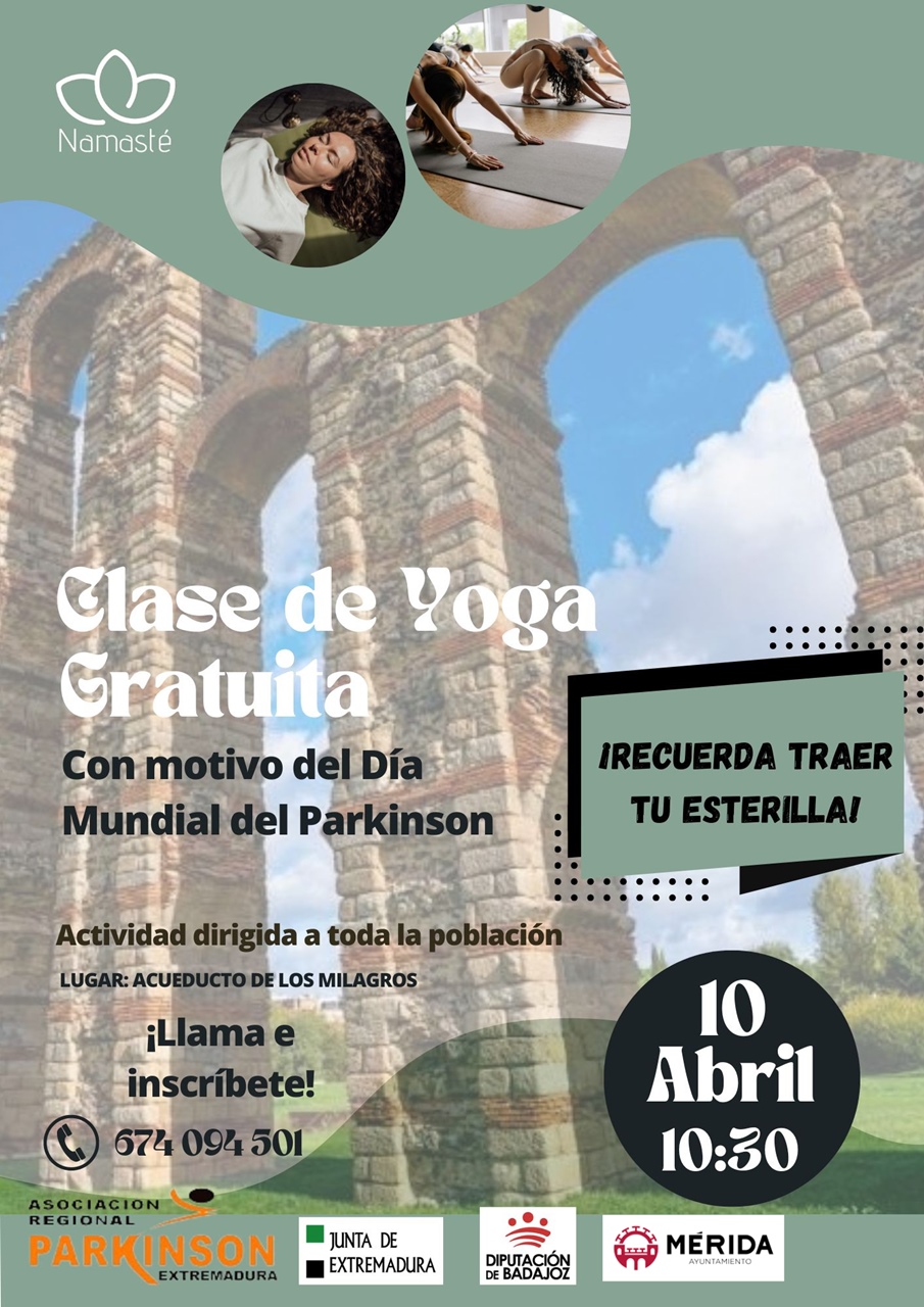 La Asociación Regional Parkinson Extremadura, con motivo del Día Mundial del Parkinson organiza, el próximo , miércoles, una clase de yoga gratuita en el Acueducto de los Milagros dirigida a la población en general.