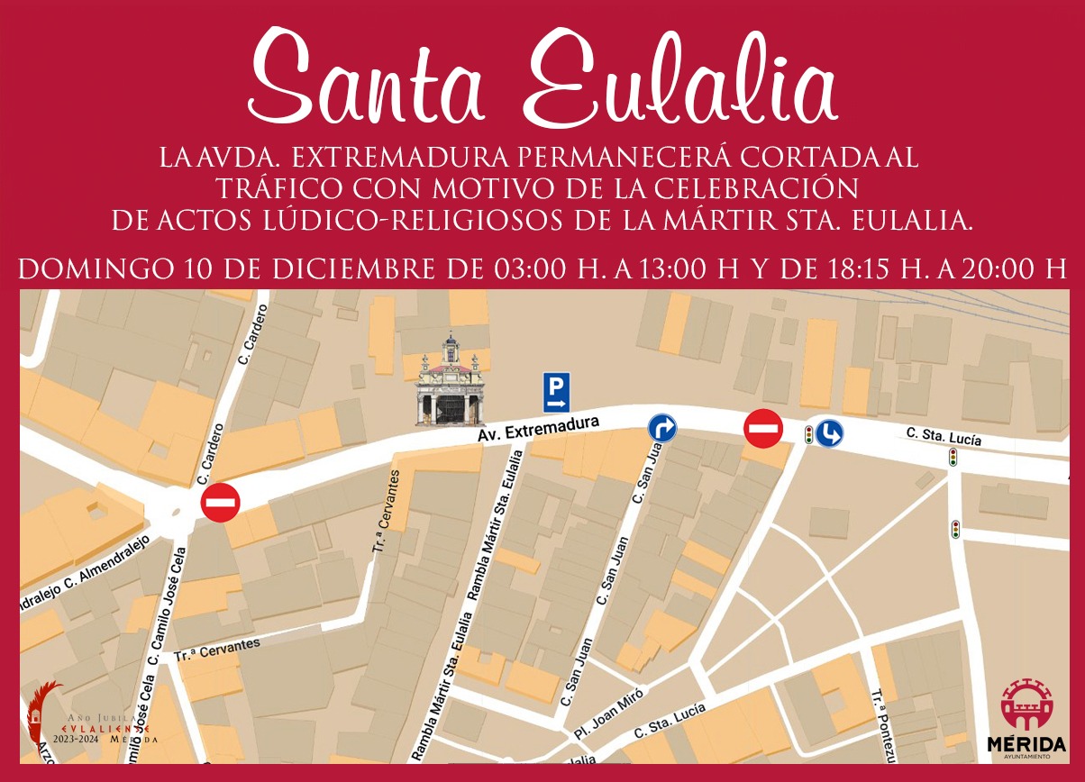 La delegación de Policía Local informa que, con motivo de los preparativos de la apertura del Año Jubilar este domingo, la Avenida de Extremadura se cortará al tráfico desde las 3 de la madrugada del 10 de diciembre hasta que finalice la procesión de Santa Eulalia.