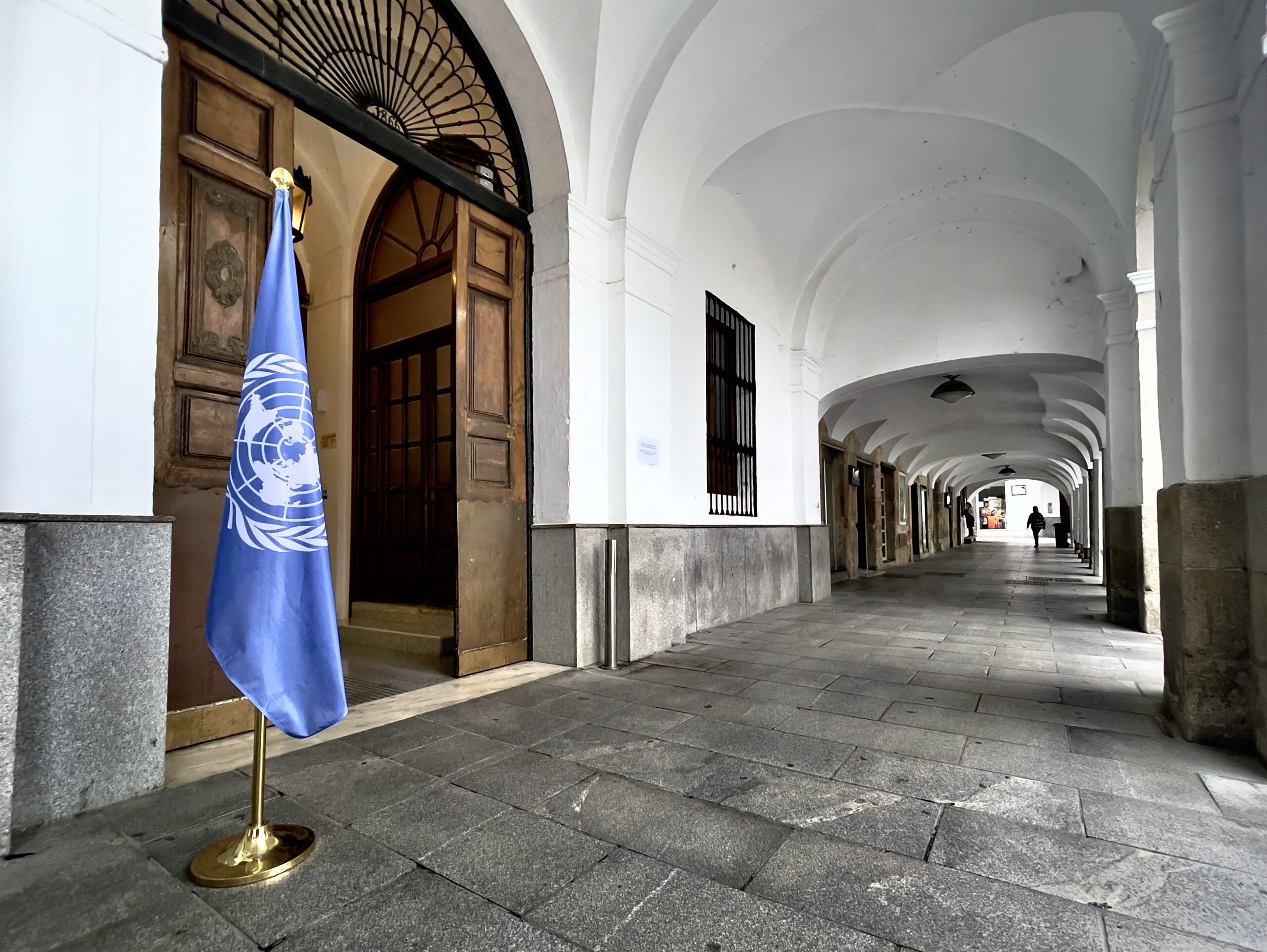 La bandera de las Naciones Unidas ondea en la puerta principal del Ayuntamiento