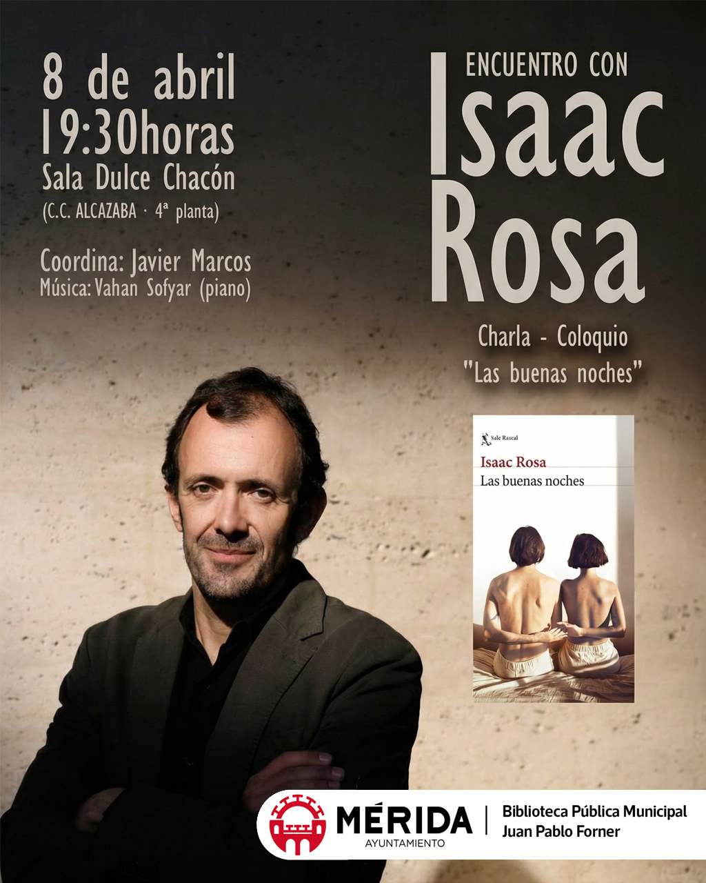 El próximo miércoles 8 de abril, a las 19:30h, la sala Dulce Chacón de la Biblioteca Municipal ‘Juan Pablo Forner’ acogerá un encuentro literario con el escritor Isaac Rosa, con motivo de la presentación de su última novela, “Las buenas noches”.