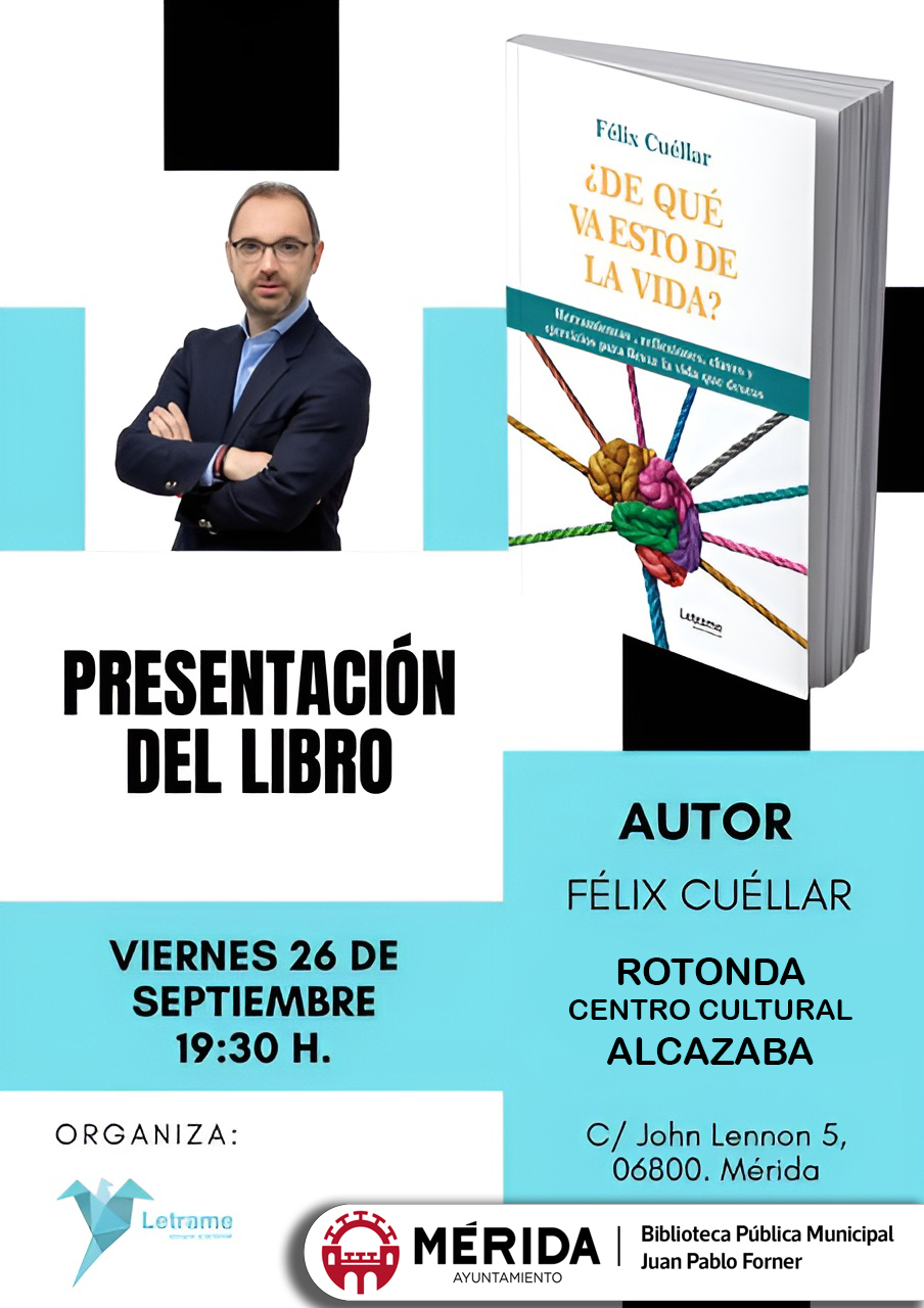 El próximo viernes 26 de septiembre, a las 19:30 horas, la rotonda central del Centro Cultural Alcazaba de Mérida, donde se encuentra la biblioteca municipal, se presentará el libro “¿De que va esto de la vida?” del autor emeritense y especialista en Inteligencia Emocional, Félix Cuéllar.