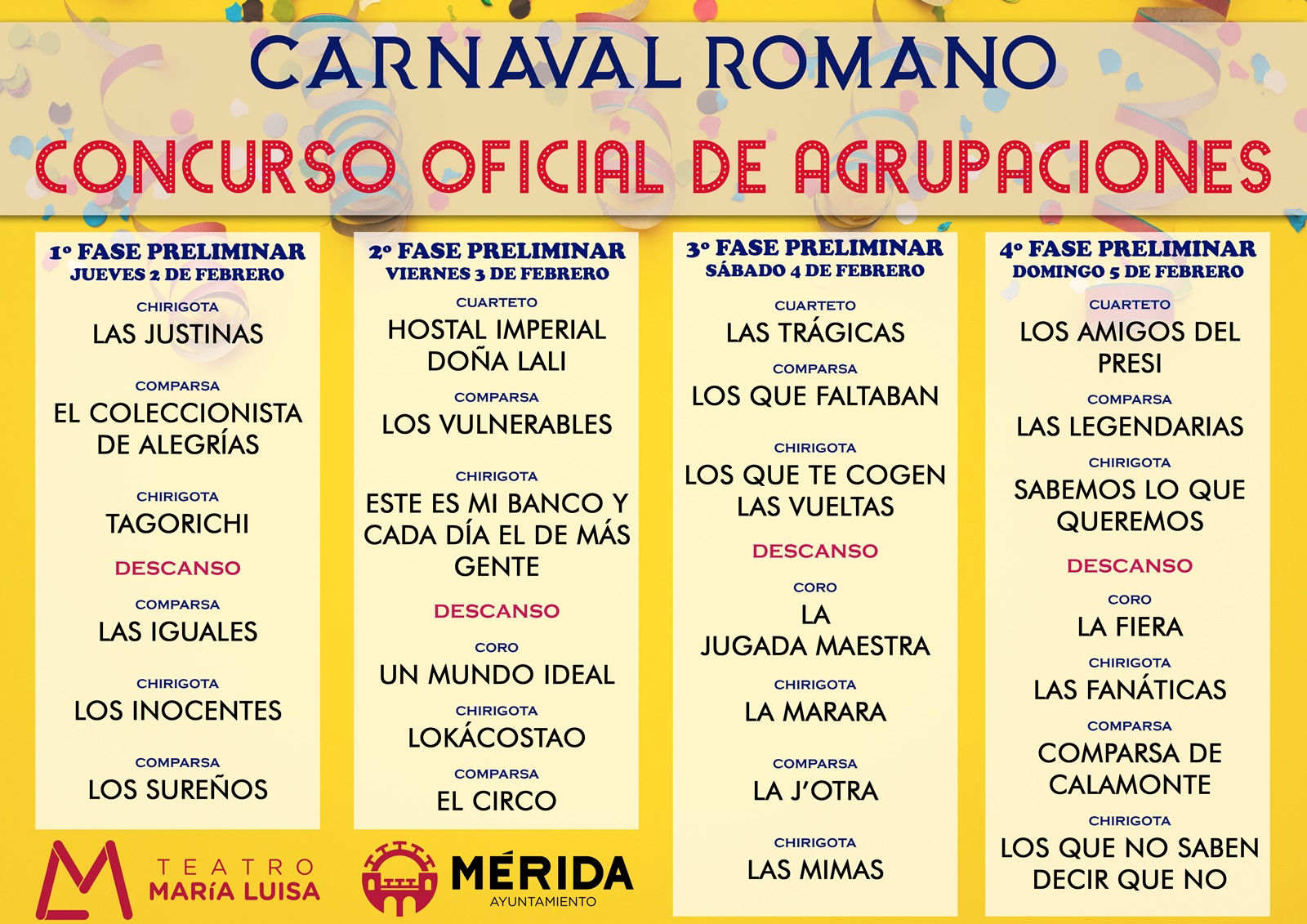 - Las sesiones de preliminares de las agrupaciones adultas se celebrarán del jueves 2 de febrero al domingo 5 de febrero en el Teatro María Luisa.