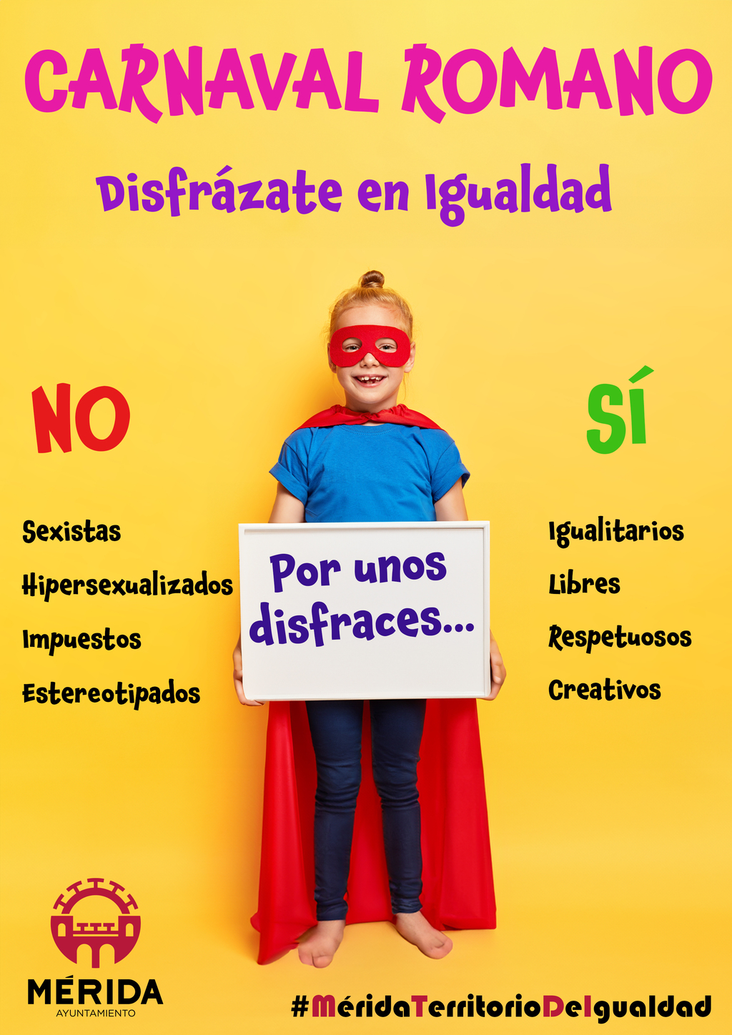 La delegación de Igualdad de Oportunidades entre mujeres y hombres, lanza un año más, de cara a la próxima edición del Carnaval Romano, la campaña “Disfrázate en Igualdad” destinada a familias y a la ciudadanía en general con el objetivo de concienciarles en que los disfraces deben ser flexibles y creativos, rompiendo con los estereotipos asignados a mujeres y hombres, así como adaptarlos a su edad.
