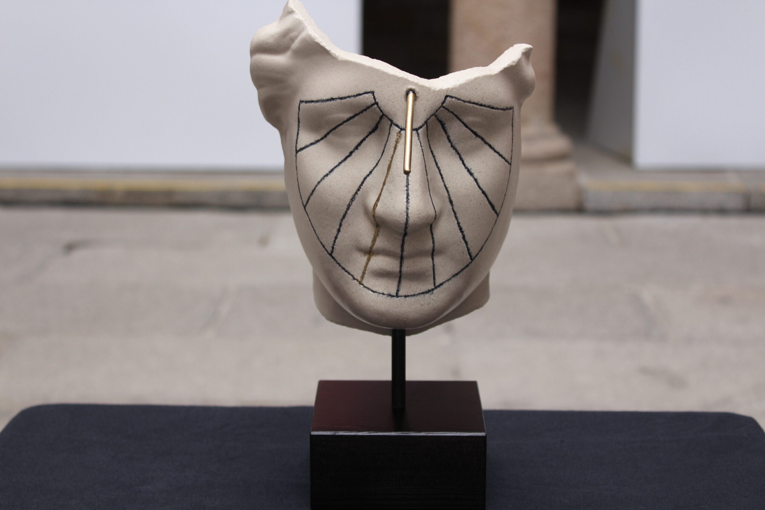 Para el creador de la obra, Juanma Pérez, “en esta pieza no sólo vemos el reflejo de la idea de parar el tiempo, sino también la simbiosis con Mérida, con el Teatro Romano y con el museo, destacando el reloj solar encontrado en el Teatro”. A esta máscara se le añade “un trazo de oro con la importancia que cada uno le pueda dar al tiempo”.