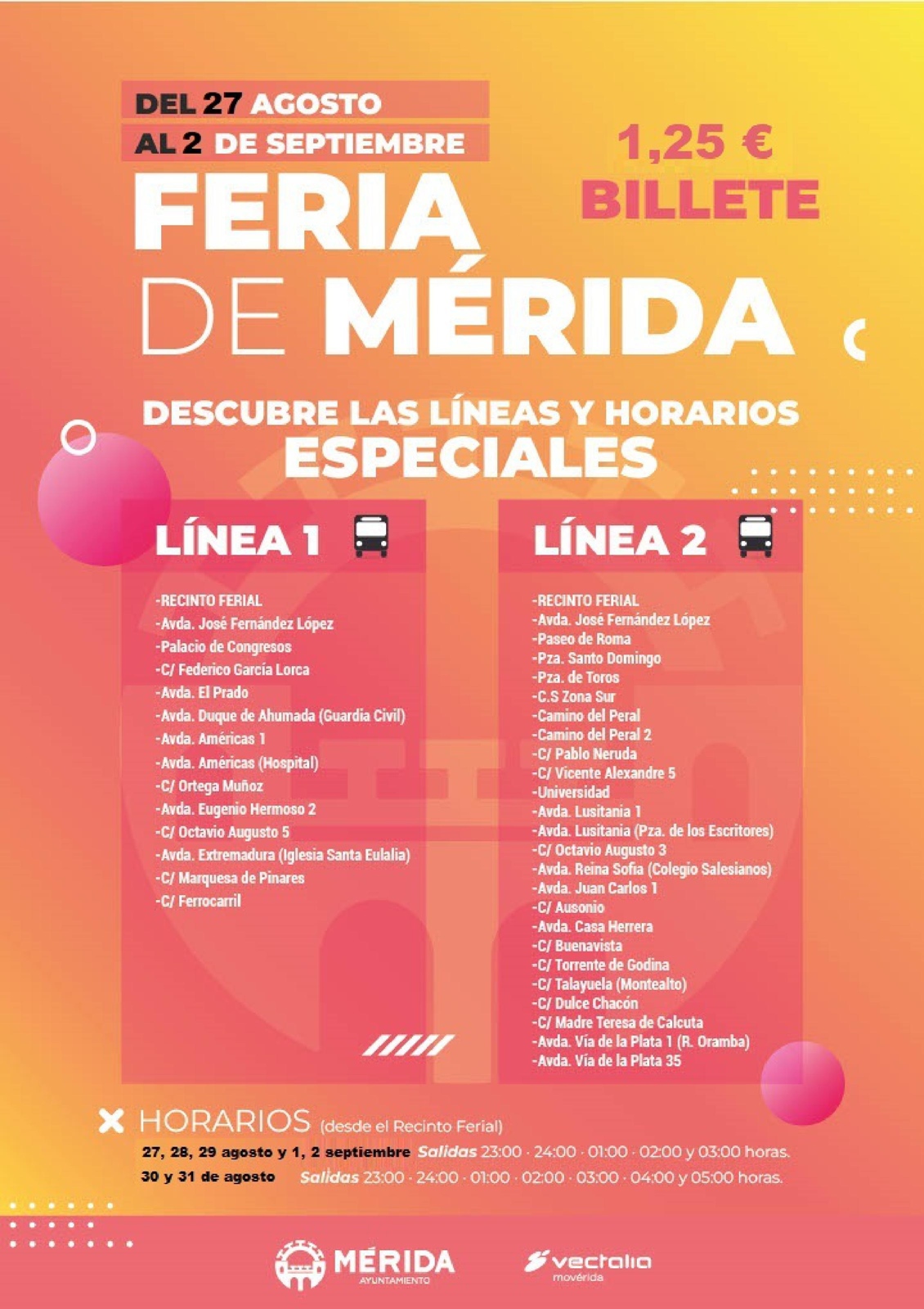 De esta manera, los días 27, 28 y 29 de agosto y 1 y 2  septiembre realizarán la última salida desde el Ferial a las 3h, y los días 30 y 31 de agosto a las 5 h. La frecuencia de estas líneas será cada hora, y se realizarán todos los días de Feria; su precio será 1,25 €.