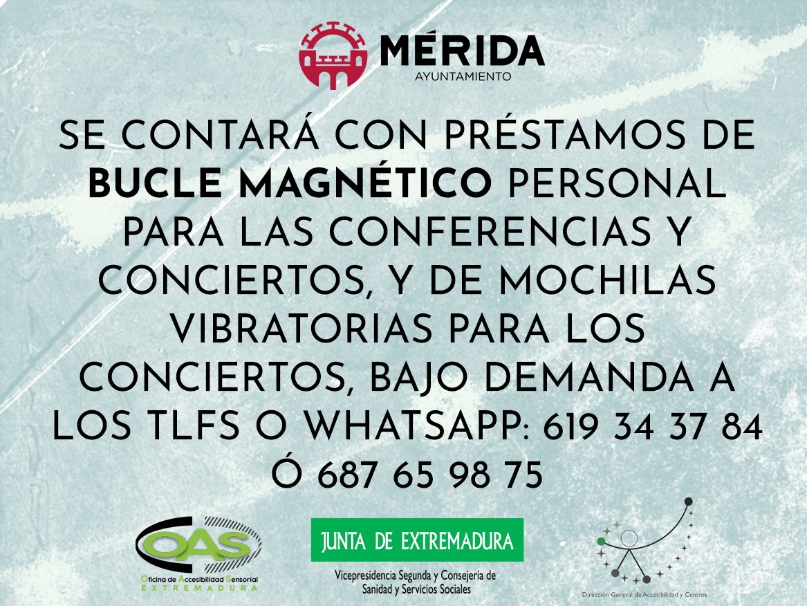 Además, para los conciertos se pondrán a disposición, bajo demanda, mochilas vibratorias para todas las personas que lo necesiten, solicitándolos, tanto el bucle como la mochila, al teléfono o Whatssapp 619 343 784 y 687 659 875.