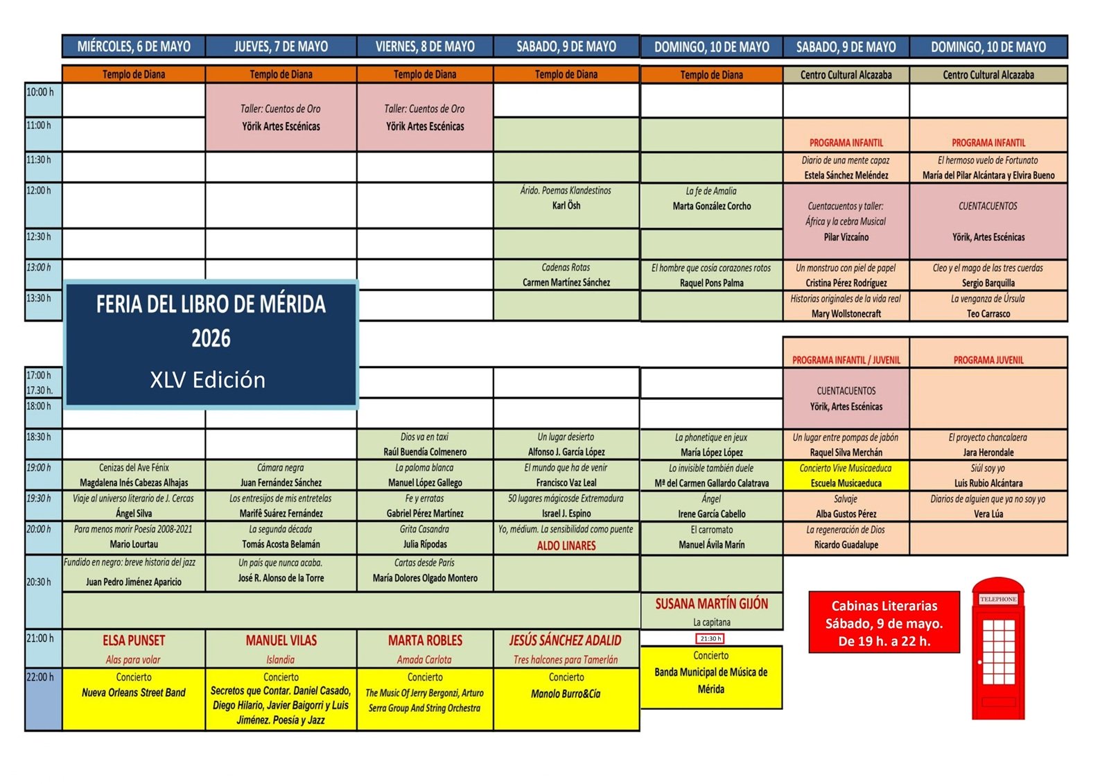 Asimismo, en el recinto del Templo de Diana se instalarán cabinas literarias, un atractivo donde los visitantes podrán descolgar un teléfono para escuchar a autores conocidos narrando sus propios textos.