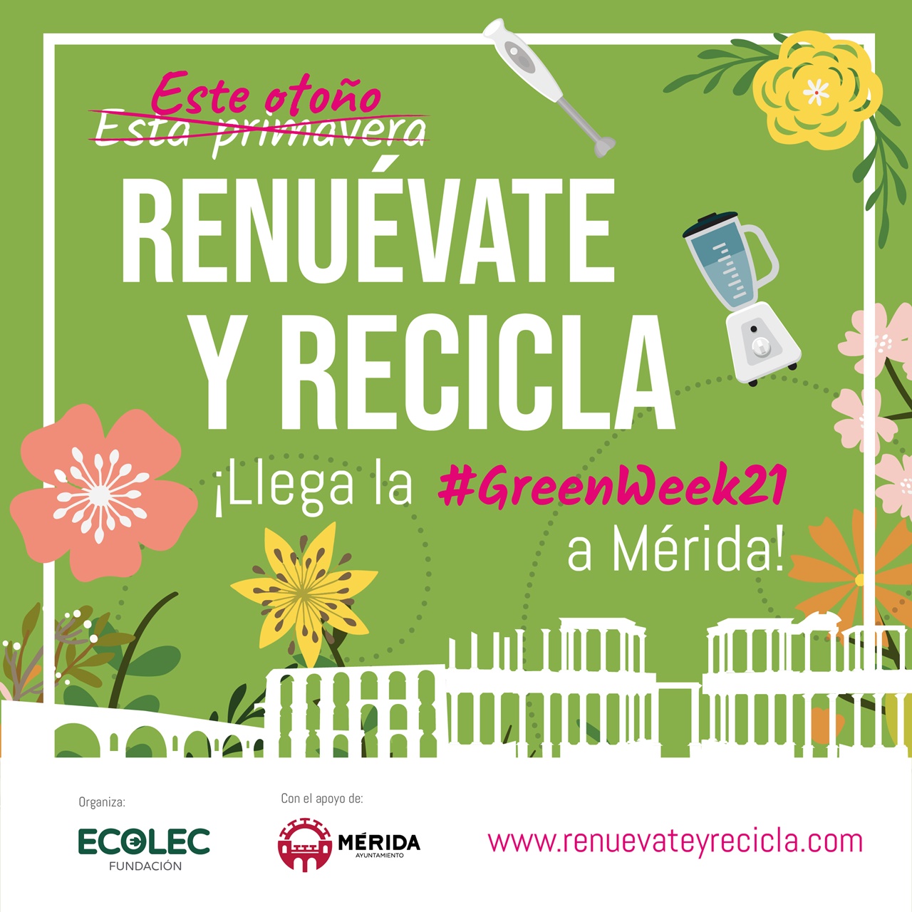 La Fundación Ecolec organiza por quinto año consecutivo, entre los días 20 de septiembre y 14 de octubre, su #GreenWeek21 para concienciar sobre la recogida de los residuos de aparatos eléctricos y electrónicos, conocidos por sus siglas RAEE. La campaña, que ya se ha convertido en una cita obligatoria del calendario, ha recogido en sus cuatro primeras ediciones más de cinco toneladas de RAEE y además sigue aumentando el número de ciudades que participan año tras año en la iniciativa y que en este 2021 contará con la ciudad de Mérida y con la colaboración de su Ayuntamiento. En este 2021 la #GreenWeek tendrá su evento principal en Mérida el 29 de septiembre con una carpa informativa en la Plaza del Padre Panero.