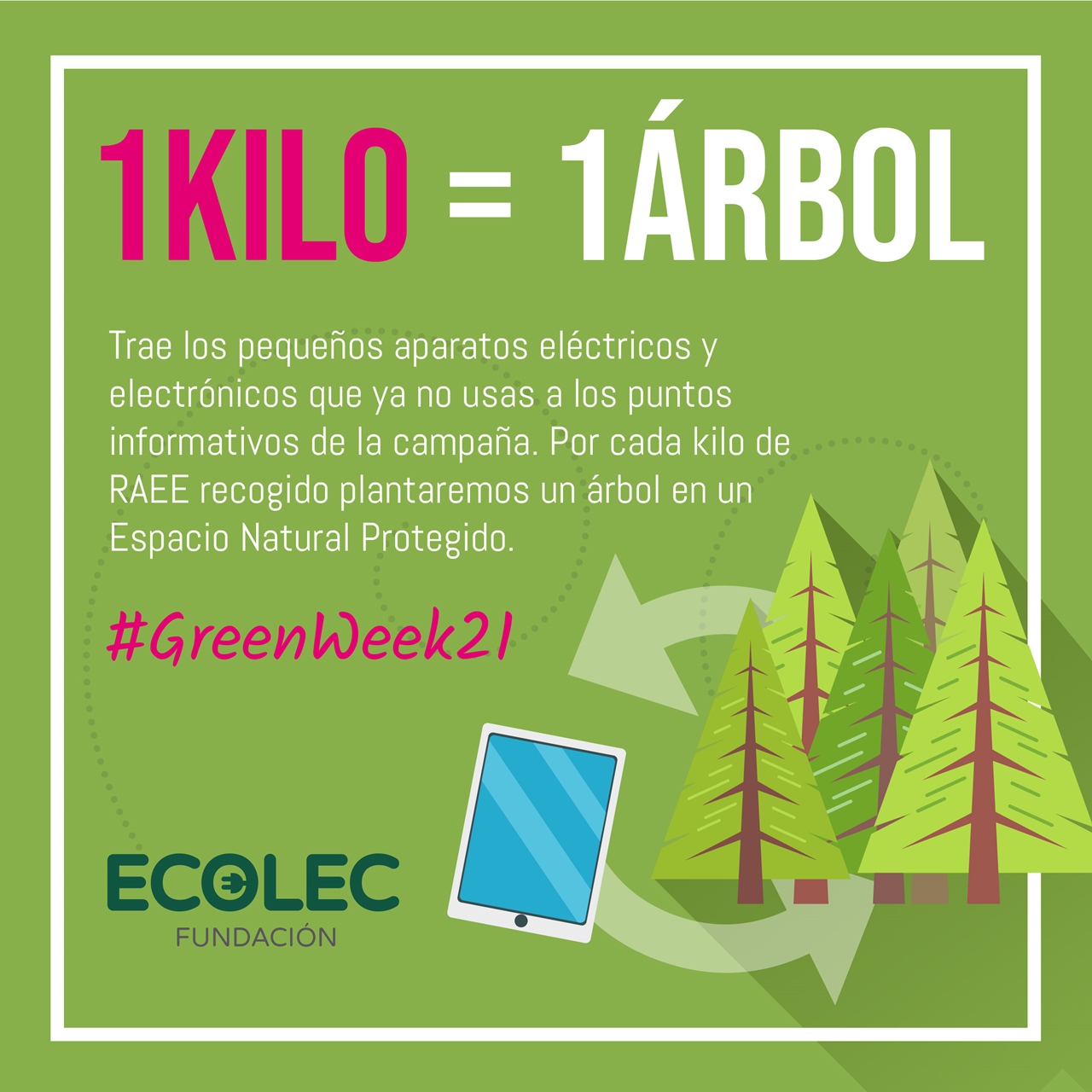 - A través de las redes sociales de la Fundación Ecolec, también se llevará a cabo la iniciativa 1 kilo X 1 árbol, que permitirá canjear la cantidad de RAEE recogida por una plantación en un Espacio Natural Protegido