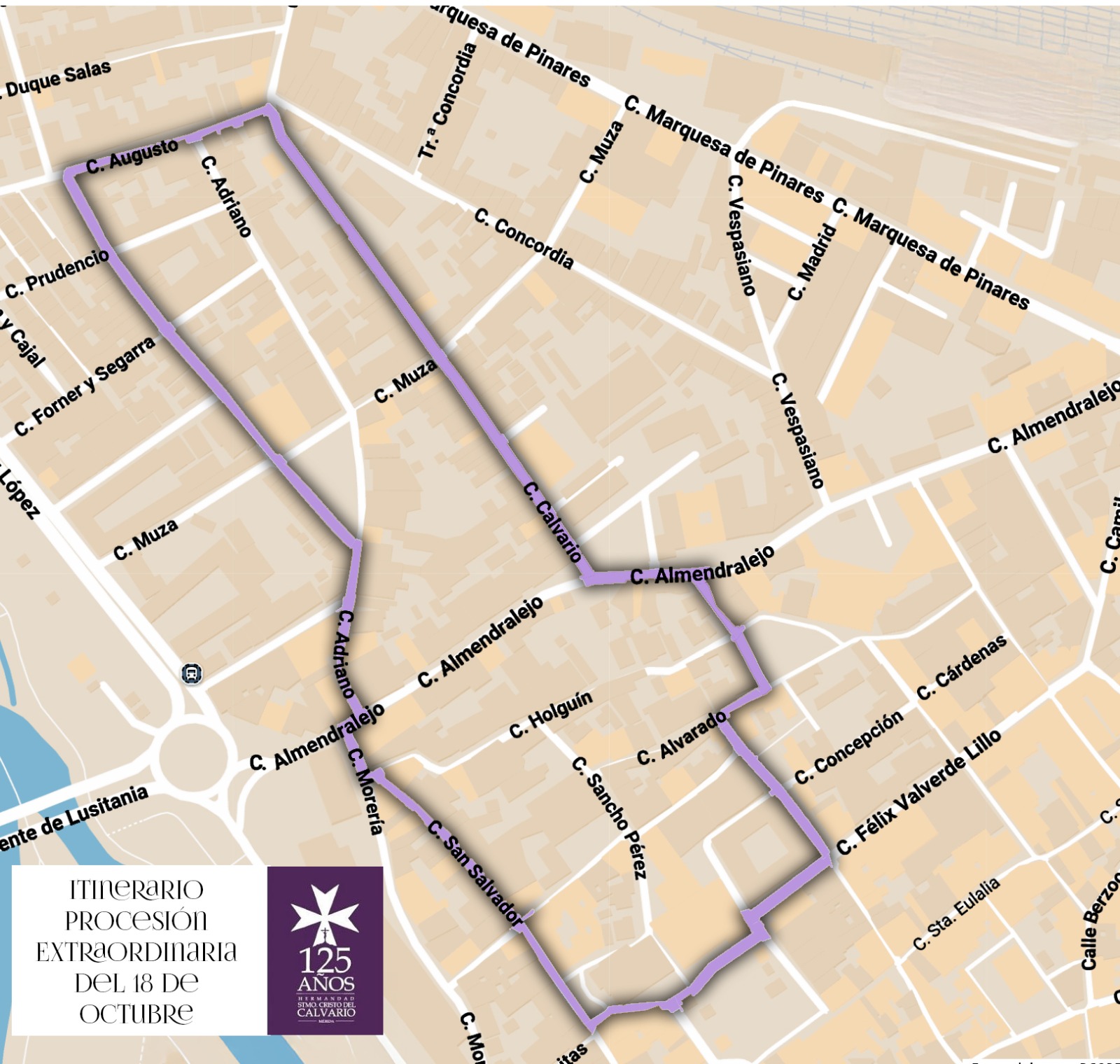 El recorrido que llevará la procesión es Calvario, Almendralejo, Travesía de Almendralejo, Plaza de la Constitución, Alvarado, Trajano, Félix Valverde Lillo, Plaza de España, Plaza de Santa María, San Salvador, Morerías (en este punto se apartará el paso de la Entrada en Jerusalén) Almendralejo, Callejón de la Amargura, Plaza de Luis Chamizo, Capitán Francisco Almaráz, Augusto y ermita del Calvario.