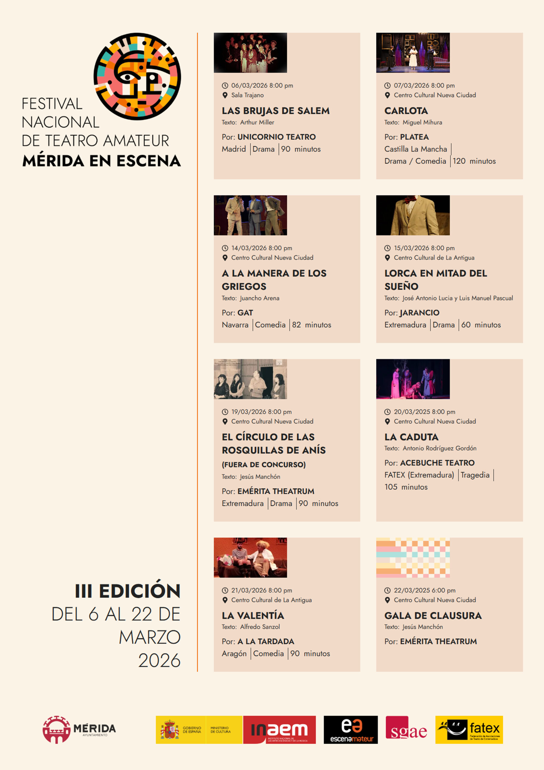 Gala de clausura: Se celebrará el 22 de marzo a las 18:00 h en el Centro Cultural Nueva Ciudad. La gala estará a cargo de la compañía local Emérita Theatrum, bajo la dirección de Jesús Manchón, y en ella se entregarán los galardones del festival, incluyendo los premios a mejor grupo, dirección, interpretación y autoría.