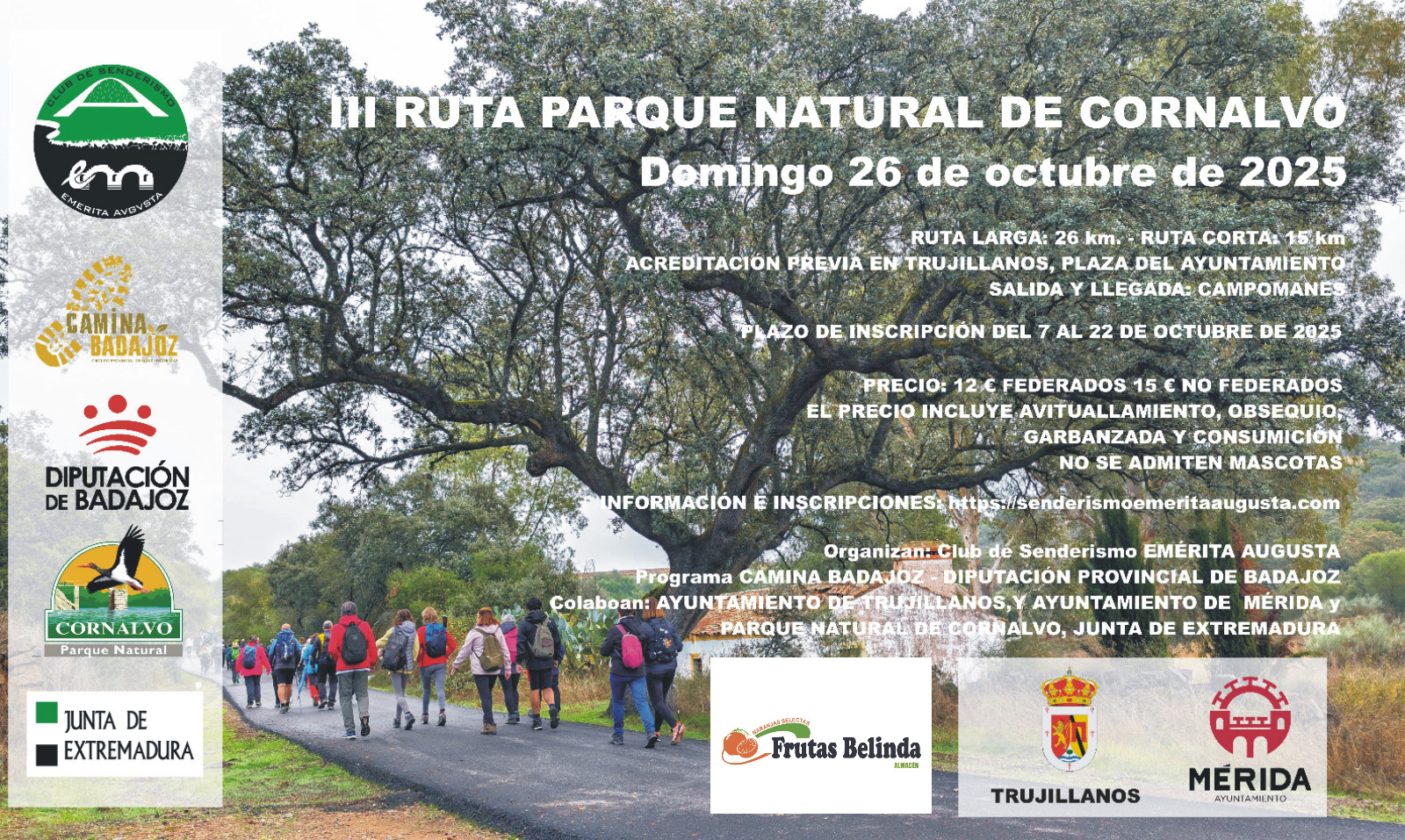 El Club de Senderismo Emérita Augusta organiza una nueva edición de la Ruta Parque Natural de Cornalvo, el domingo 26 de octubre, en el marco del Programa Camina Badajoz, de la Diputación Provincial de Badajoz, contando con la colaboración de los Ayuntamientos de Trujillanos y de Mérida y del Parque Natural de Cornalvo.