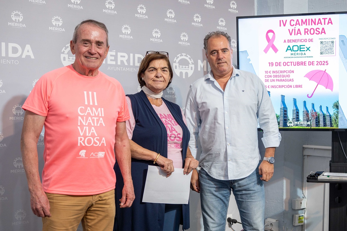 La IV Caminata Vía Rosa se celebrará en Mérida el próximo 19 de octubre de 2025, “con el objetivo de visibilizar la problemática de las enfermedades oncológicas y apoyar la labor de la Asociación Oncológica Extremeña (AOEx), destinataria de los fondos recaudados a través de las inscripciones” explica en la presentación de esta actividad deportiva y solidaria el delegado de deportes, Toni Marín.