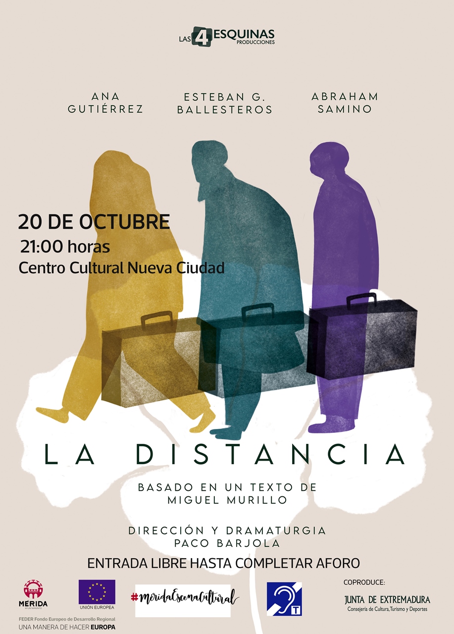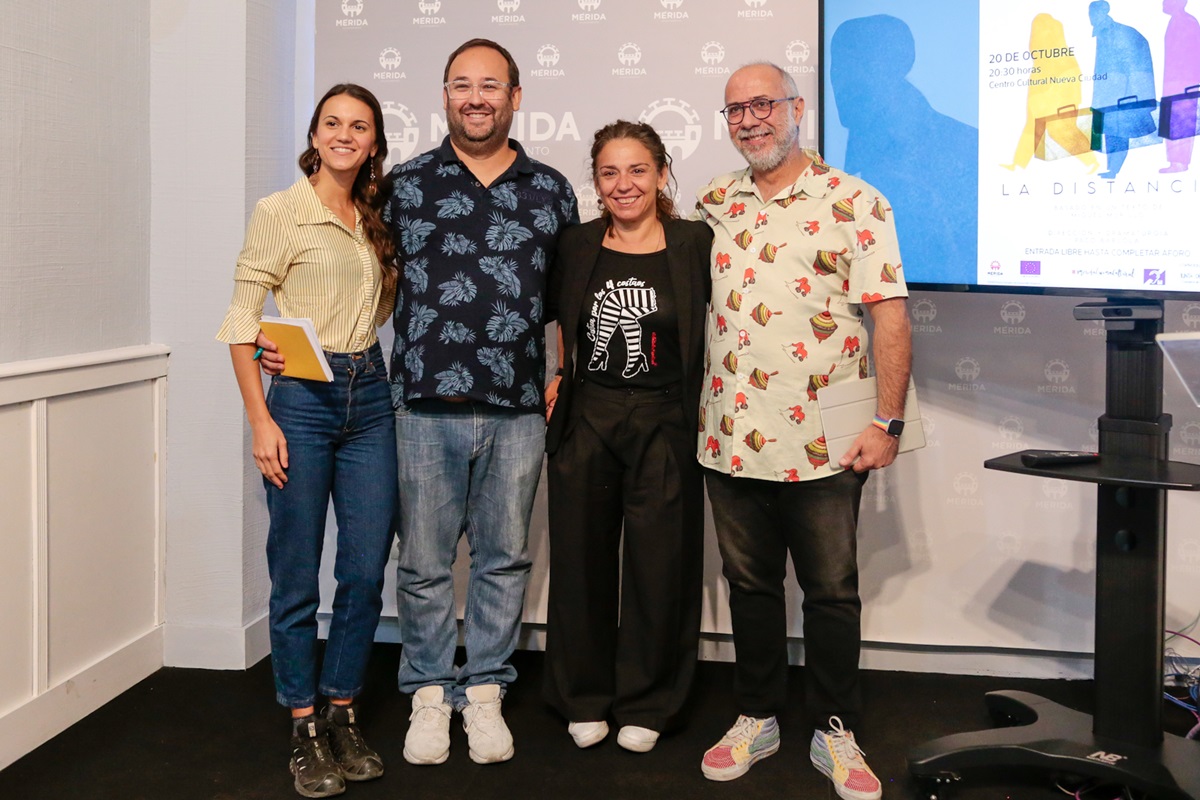 La delegada de cultura, Silvia Fernández, ha mostrado “el orgullo que supone presentar una obra como La Distancia, de la compañía emeritense Las 4 esquinas, además con un reparto integrado por emeritenses; es una obra que tenemos que verla casi por obligación por la relevancia de los temas que trata, por su calidad, es una gran sorpresa que consigue emocionar hablándonos de la vida”. La obra se estrena el 20 de octubre, a las 21 horas, en el Centro Cultural de Nueva Ciudad, con entrada libre hasta completar aforo. “Para el Ayuntamiento es una suerte y privilegio contar en la ciudad con una compañía como Las 4 esquinas y con sus integrantes, siempre creando con calidad e innovación”.
