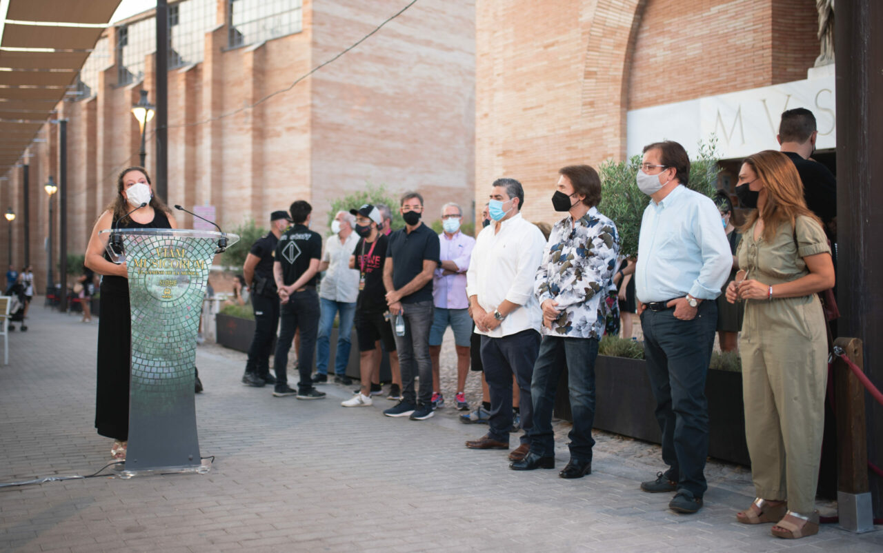 El acto se realizó en la calle José Ramón Mélida, lugar donde va a estar este Paseo de la Música, y estuvieron también presentes el presidente de la Junta de Extremadura, Guillermo Fernández Vara, el director del festival, Carlos Lobo, y el artista Raphael, que fue el primero en descubrir su placa.