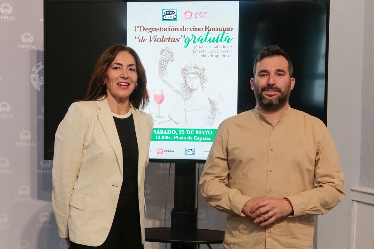 El delegado de Turismo, Felipe González, y la directora de Onda Cero en Extremadura, María Ortíz, han presentado esta mañana la I degustación gratuita de vino romano “de violetas” que se celebrará este sábado, a las 13 horas, en la Plaza de España, dentro de la programación de Emerita Lvdica.