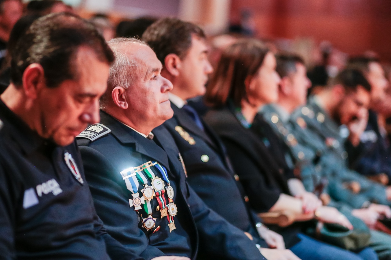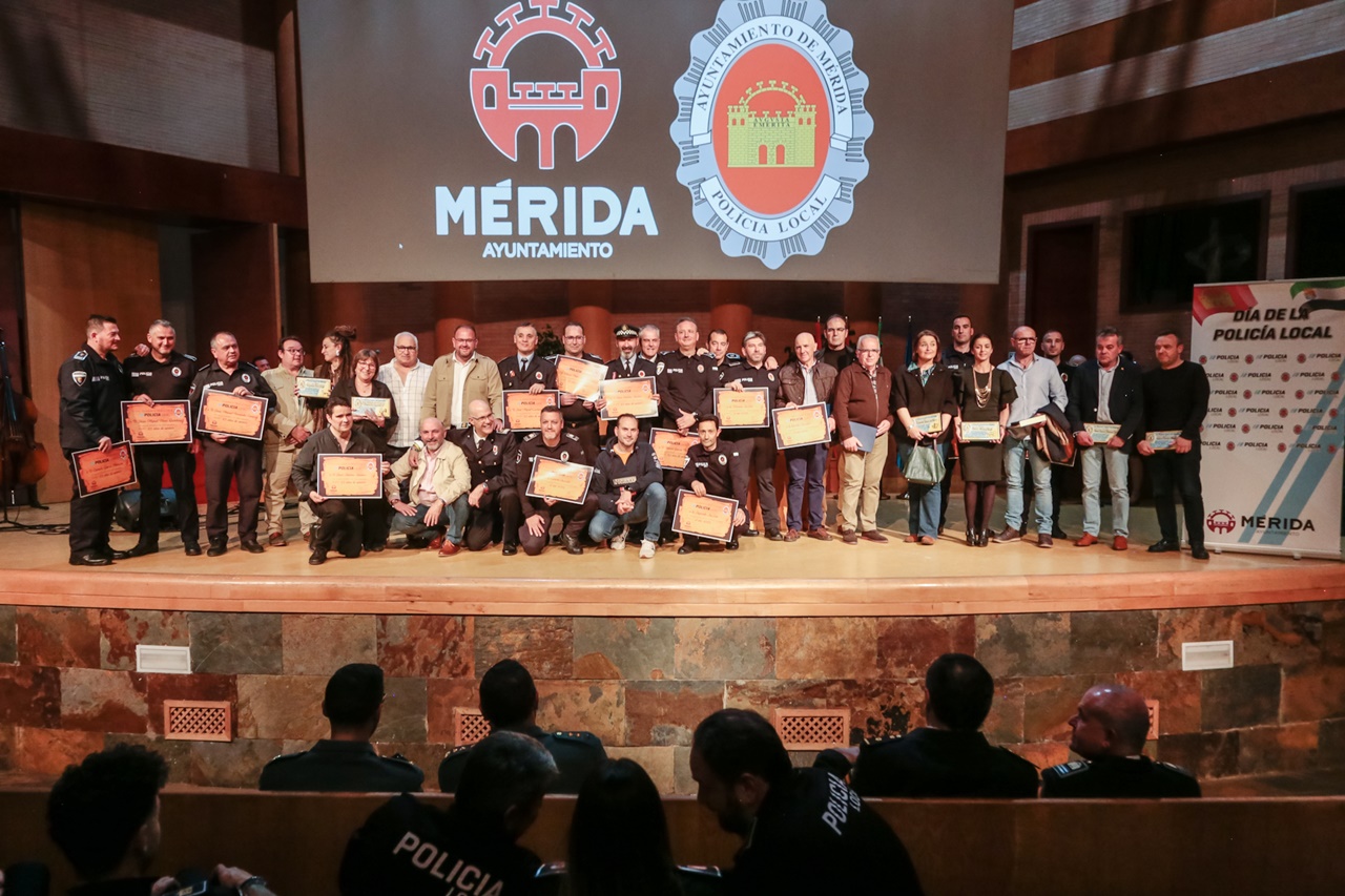 La Policía Local de Mérida ha celebrado hoy su día con un acto en el Centro Cultural Alcazaba en el que se ha reconocido la labor profesional de varios agentes, la trayectoria de los que se han jubilado este año o han cumplido veinticinco años de servicio y se ha agradecido el compromiso y apoyo de distintas personalidades e instituciones.