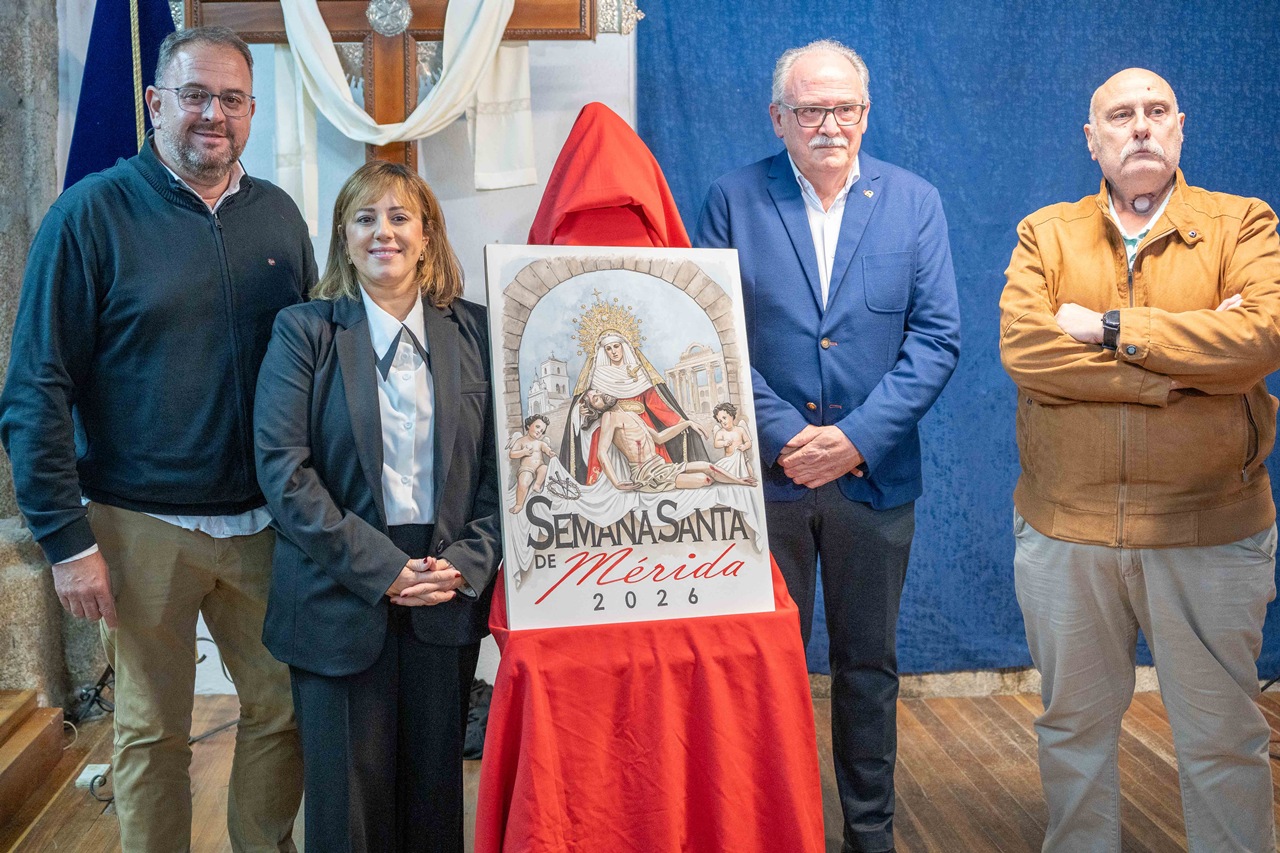 La sede de la Junta de Cofradías ha acogido, esta tarde, la presentación del cartel anunciador de la Semana Santa de Mérida 2026. Un acto que ha contado con la presencia del presidente de la Junta de Cofradías, Luis Miguel González, el alcalde de Mérida, Antonio Rodríguez Osuna, la delegada de Semana Santa, Ana Aragoneses, y los miembros del jurado del concurso de pintura que ha elegido el cartel anunciador.