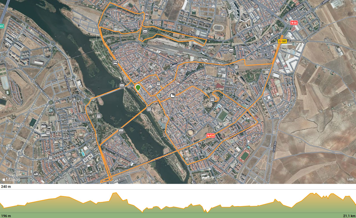 Paseo de Roma (salida), Glorieta de La Loba, Puente Romano, Paseo de los Rosales, Glorieta del Vietnam, Glorieta de “La Heredad”, Avd. José Saramago de Sousa, Avd. Reina Sofía (hacia subterráneo), Glorieta del Monumento a Don Rafael Ortega, Glorieta Patrimonio de la Humanidad, Glorieta “Mª Auxiliadora”, Glorieta de “Las 3 Fuentes” (sentido contrario hacia Avda. Reina Sofía nuevamente), entrada al Hipódromo, Avd. Juan Carlos I, Avd. Extremadura hasta “La Torre” (desde Sta. Lucía en sentido contrario), C/ Camilo José Cela, C/ Félix Valverde Lillo, Plz. España, Plz. Sta. Mª, C/ San Salvador, C/ Morería, C/ Almendralejo, Glorieta de Augusto Prima Porta, Avd. José Fernández, Glorieta de Los Barqueros, Avd. Emérita Augusta, C/ Molino Arenal de Pan Caliente, Puente Romano del Albarregas (hacia Huerta de Velázquez), Valle del Albarregas, C/ Rio Albarregas, C/ Camino Viejo de Mirandilla (hasta confluencia con C/ Felipe Corchero), Valle del Albarregas, Avd. Vía de la Plata, Glorieta con Avd. de los Milagros (sentido contrario), Avd. de Vía de la Plata (nueva- mente), Glorieta con Avd. del Lago, Ronda de los Eméritos, Glorieta de Marco Agripa, Avd. Emérita Augusta, Glorieta del Ferial, Avd. Emérita Augusta, Glorieta de Los Barqueros, Avd. José Fernández, Glorieta de Augusto Prima Porta, Puente Lusitania, Glorieta de La Capitalidad, Avd. de la Libertad, Glorieta de la Función Pública, Paseo de los Rosales, Glorieta de Vietnam, Glorieta del Polígono La Heredad (vuelta y de nuevo hacia Paseo de los Rosales), Glorieta de Vietnam, Paseo de los Rosales, Puente Romano, C/ Cava, Plaza del Rastro, C/ Graciano, C/ Atarazanas, C/ Anas, Avd. Lusitania, Glorieta de Las Monjas, Avd. Lusitania, C/ Octavio Augusto, Glorieta Patrimonio de la Humanidad, C/ Octavio Augusto, Glorieta diosa Ceres, Plaza Margarita Xirgu, entrada al Teatro/Anfiteatro Romano, C/ José Ramón Mélida, C/ Sagasta, C/ Romero Leal, Plaza del Rastro, Plaza España (sentido contrario), C/ Félix Valverde Lillo, C/ Trajano, C/ Alvarado, Plaza de La Constitución, Travesía Almendralejo, Almendralejo (sentido contrario), Paseo de Roma (meta).