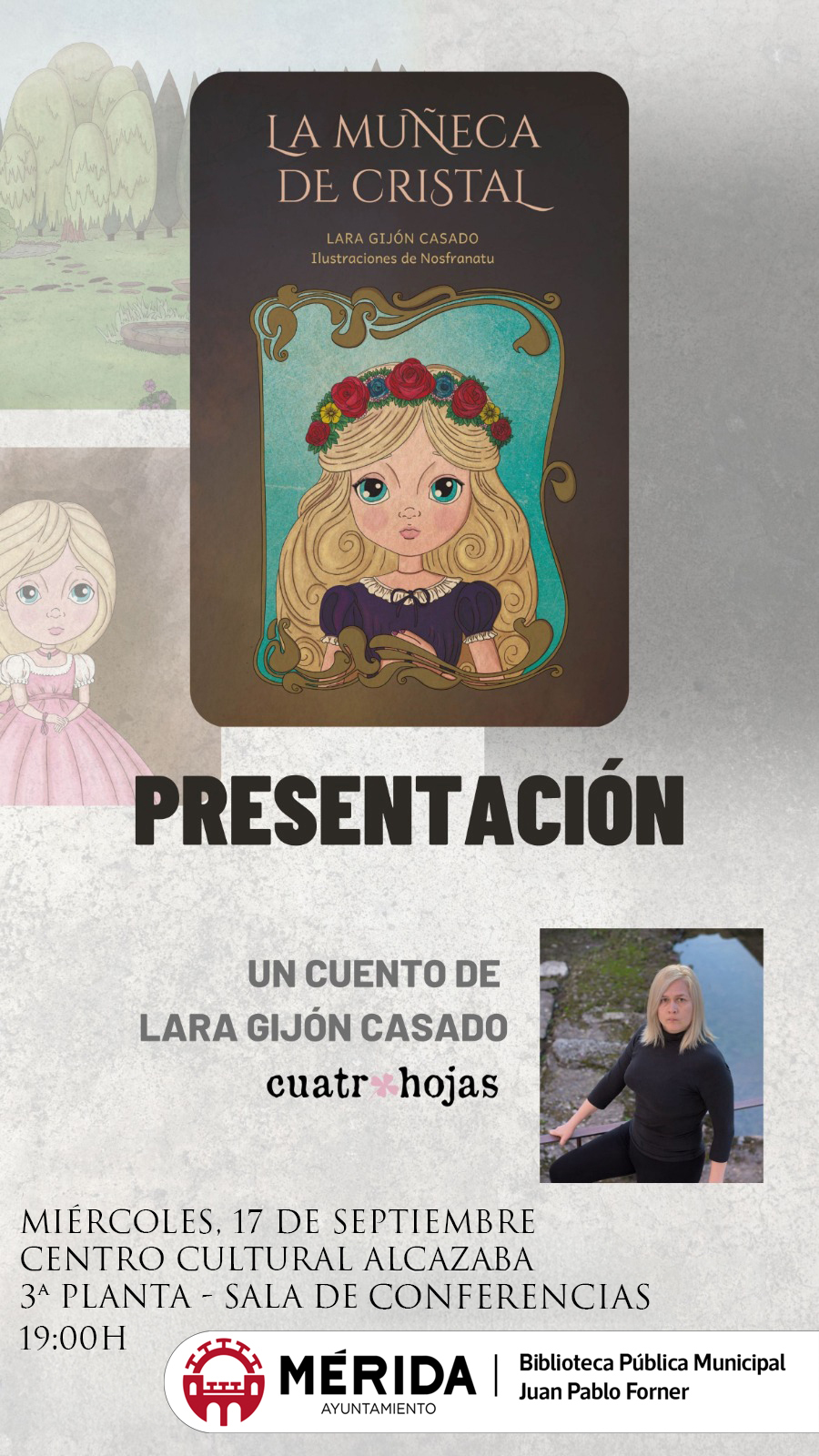 El próximo miércoles, 17 de septiembre, a las 19 horas, se presentará en la Biblioteca Municipal “Juan Pablo Forner” (sala de Conferencias, 3ª planta) el libro La muñeca de Cristal, de Lara Gijón Casado.