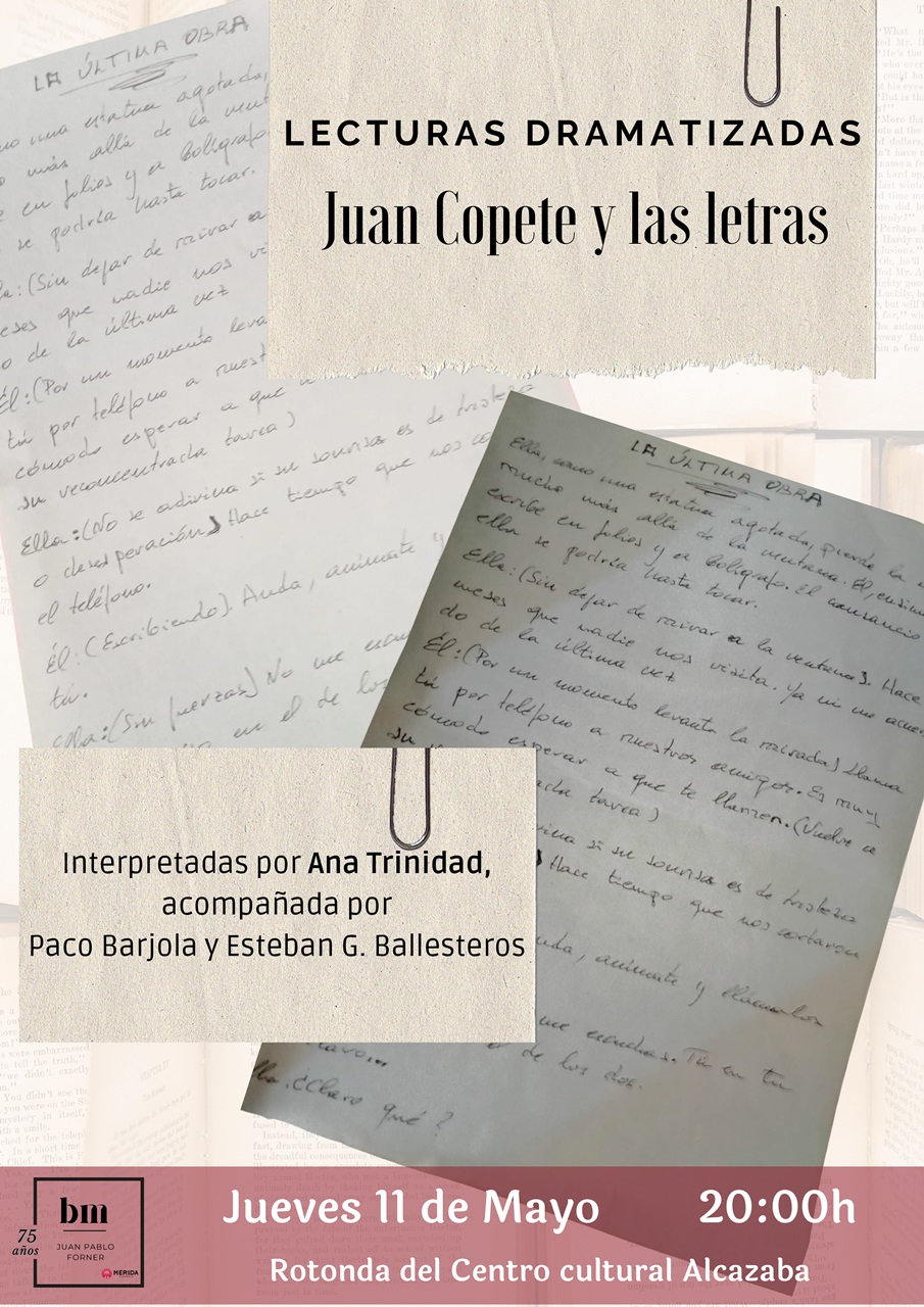 Ana Trinidad, acompañada al violín por Paco Barjola, y con la colaboración de Esteban G. Ballesteros, ofrecerá unas lecturas dramatizadas de diversas obras de Juan Copete. Será el próximo jueves, 11 de mayo, a las 20 horas, en la rotonda del Centro Cultural Alcazaba.