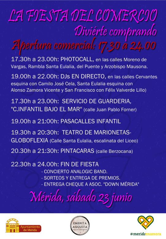Cada establecimiento es libre de organizar la actividad que desee, dentro de la “manera que quiera atraer a su clientela”. Por la noche, hasta las doce de la noche, habrá un concierto en la Puerta de la Villa amenizado por la orquesta Analogic Band y que contará con sorteos de un viaje en globo por Mérida, un patinete eléctrico y una experiencia relajante. Las papeletas para los sorteos se entregarán en los establecimientos al realizar las compras durante la tarde.