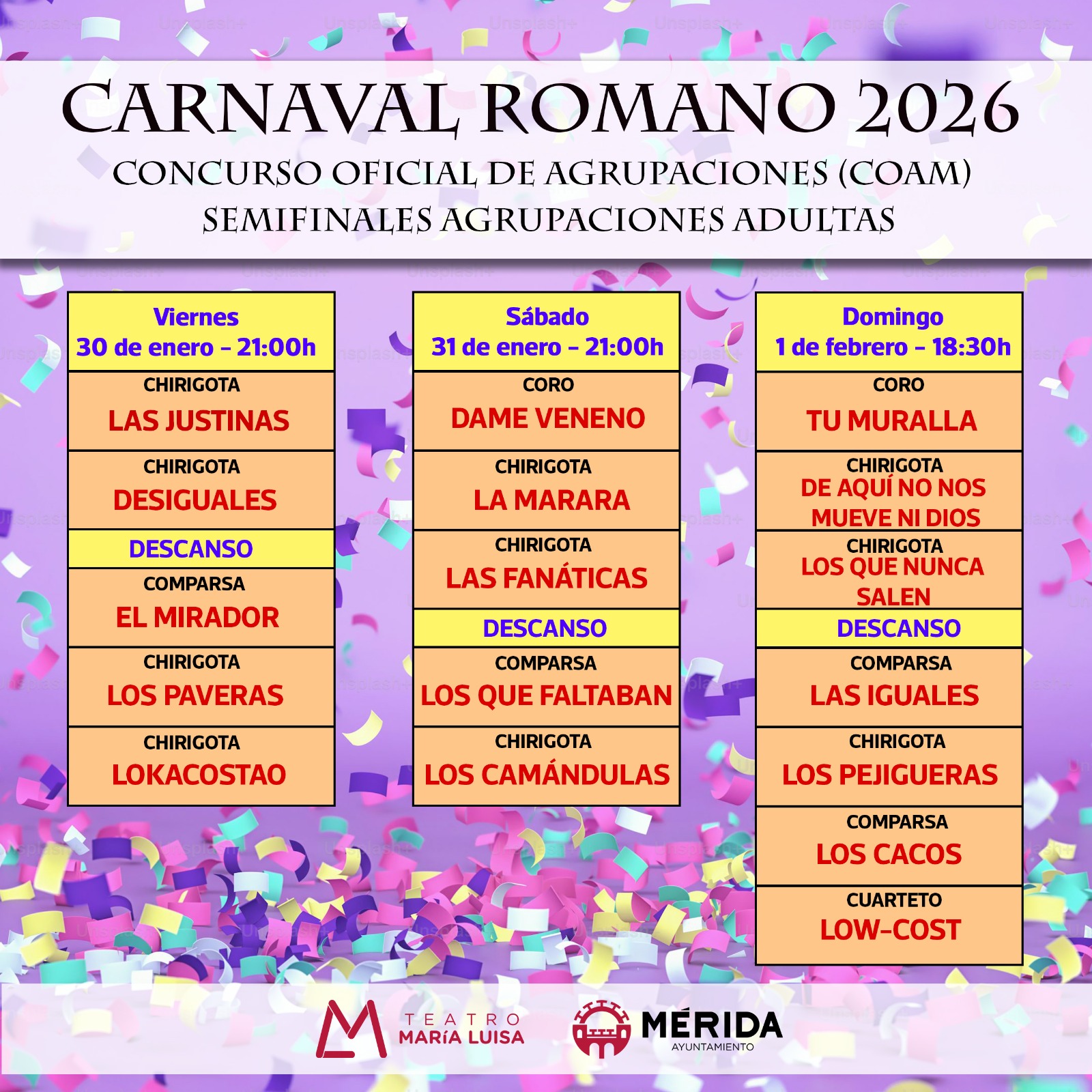Ante el inminente inicio, el próximo viernes 30 de enero, de las sesiones de semifinales del Concurso de Agrupaciones del Carnaval de Mérida, este domingo 25 de enero, a las 6 de la tarde, se abre la taquilla virtual para adquirir las entradas para poder asistir a las mismas a través de la página web www.teatromarialuisa.org/entradas/