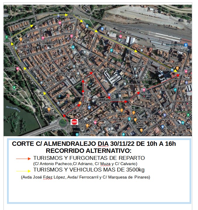 Por ello, desde las 10:00h hasta las 16:00h se cortará el acceso a esta vía. La Policía Local ha dispuesto de itinerarios alternativos. Uno para vehículos ligeros por la calle Adriano que volverá a conectar con la calle Almendralejo y otro itinerario para vehículos pesados por el Paseo de la Estación hacia Marquesa de Pinares.