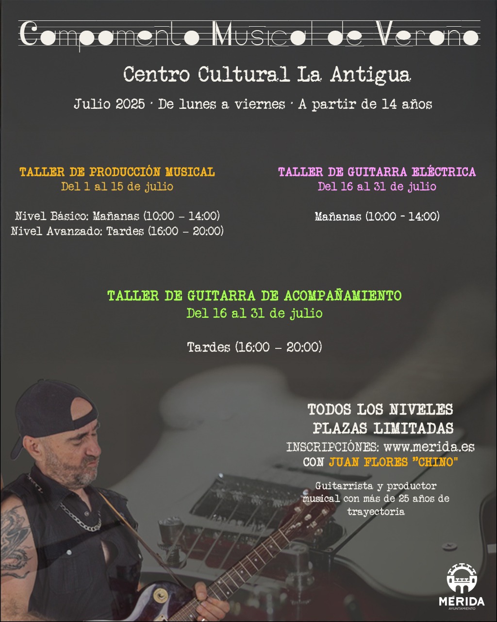 - Se harán tres cursos diferentes por quincenas. Uno es el taller de producción musical (del 1 al 15 de julio), otro es el taller de de guitarra eléctrica y otro el taller de guitarra de acompañamiento (ambos del 16 al 31 de julio). Las plazas están limitadas a 15 participantes por quincena y las inscripciones podrán realizarse a partir de mañana en la web municipal https://merida.es/servicios-municipales/cultura/campamento-musical-verano-2025/.