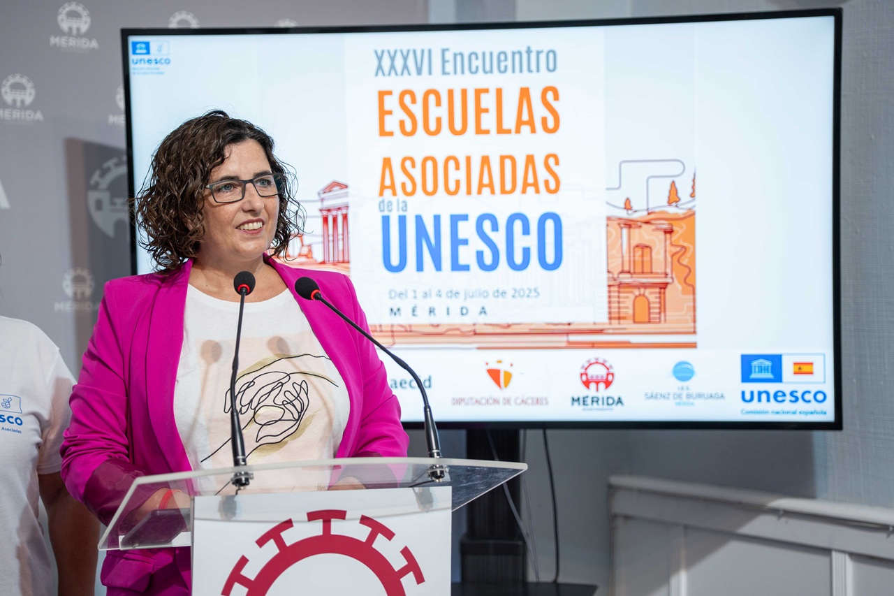 - La delegada de Educación, Susana Fajardo, ha señalado que, con este encuentro “se va a tratar de visibilizar el trabajo que vienen haciendo todos los centros educativos que están asociados a la UNESCO, invitando a otros centros de Mérida y Extremadura, por supuesto, a que se unan a estos centros asociados y que puedan visibilizar sus trabajos y que puedan ser conocidos internacionalmente y crear esa red.