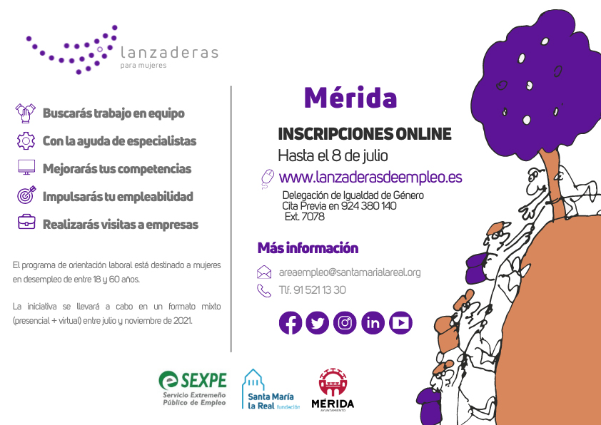 La nueva Lanzadera de Empleo de Mérida comenzará a funcionar a mediados de julio y estará operativa hasta mediados de noviembre, ofreciendo de forma gratuita orientación laboral, acompañamiento y asesoramiento a mujeres en situación de desempleo, con edades comprendidas entre los 18 y los 60 años. Pueden tener cualquier nivel de estudios (ESO, Formación Profesional, Bachillerato, Universidad, Master, etc.) y proceder de cualquier sector profesional, con o sin experiencia previa.