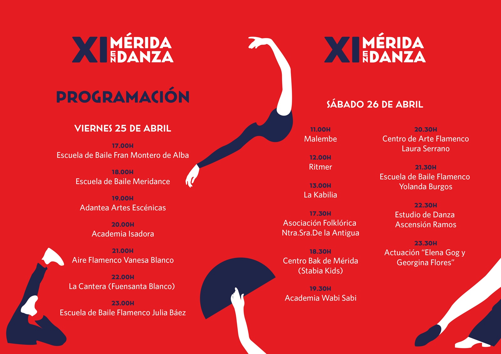 Mérida en Danza alcanza este año su XI edición y se celebra los días 25 y 26 de abril, en el templo de Diana. El evento contará con la participación de 16 academias y agrupaciones de baile y danza de nuestra ciudad y más de mil personas sobre el escenario “en una de las actividades multitudinarias y más alcance de la cultura de Mérida” explica Antonio Vélez, delegado de cultura.
