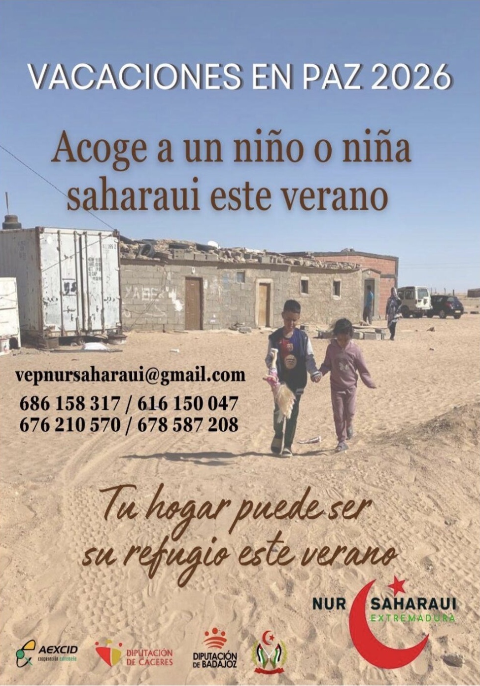 • El plazo para participar en esta nueva edición del programa `Vacaciones en Paz´ estará abierto hasta el 28 de febrero de 2026. Las familias interesadas o las personas que deseen colaborar con esta iniciativa solidaria pueden contactar con la Asociación NUR Saharaui Extremadura a través de los teléfonos:+34 686 158 317 / +34 616 150 047, o mediante los correos electrónicos:   nursaharaui@gmail.com / vepnursaharaui@gmail.com