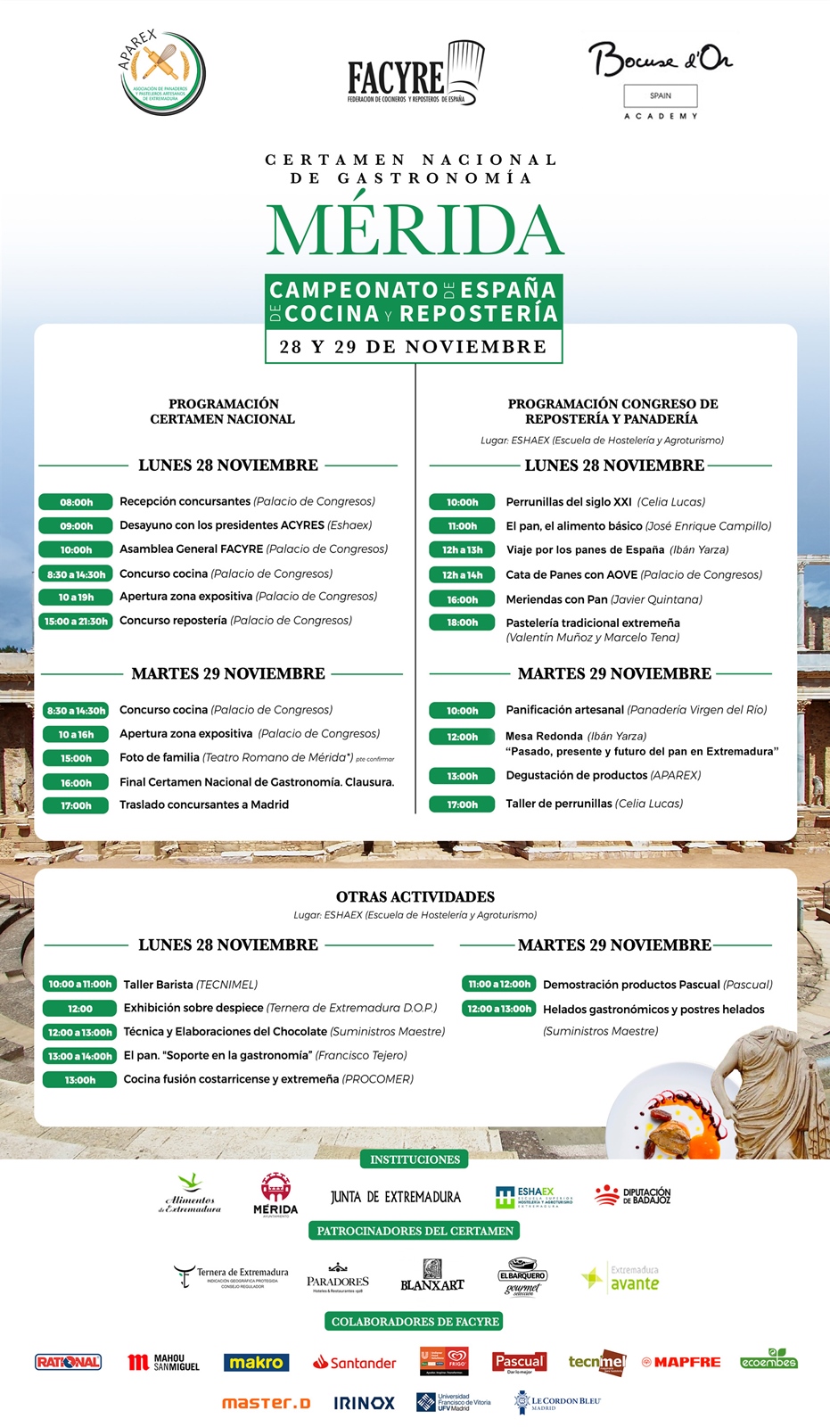 - La cita será en el Palacio de Congresos y la Escuela de Hostelería los días 28 y 29 de noviembre y está organizada por la Federación de Cocineros y Reposteros de España (Facyre) y por la Asociación de Panaderos y Pasteleros Artesanos de Extremadura (Aparex)