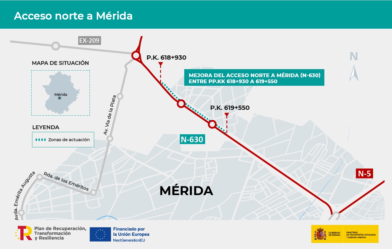 El Ministerio de Transportes, Movilidad y Agenda Urbana (Mitma) ha adjudicado, por un importe de 2,45 millones de euros (IVA incluido), las obras del acceso norte a Mérida entre los km 618,930 y 619,550 de la carretera N-630, en la provincia de Badajoz.
