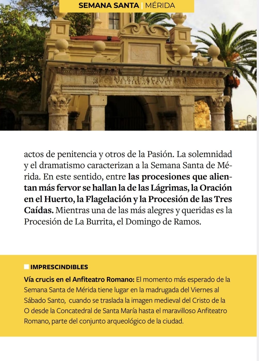 Un recorrido por las principales Semanas Santas de España donde Mérida tiene un lugar protagonista. Según este especial de la revista de divulgación, se afirma que nuestra celebración de la Pasión transcurre por un entorno histórico “reconocido por la Unesco como Patrimonio de la Humanidad. Los orígenes de este rito en la ciudad se remontan a los desfiles que en el siglo XIII se realizaban desde la Catedral de Santa Ierusalem (actual Santa María la Mayor) a la Basílica de Santa Eulalia”, destacan.