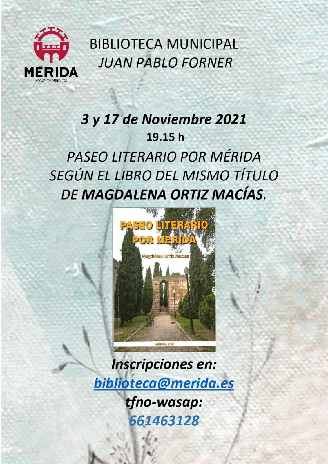 Siguiendo con las actividades organizadas por la delegación de bibliotecas el próximo día de 3 noviembre a las 17 horas se va a realizar un Paseo Literario por Mérida siguiendo el libro del mismo título de Magdalena Ortiz Macías.