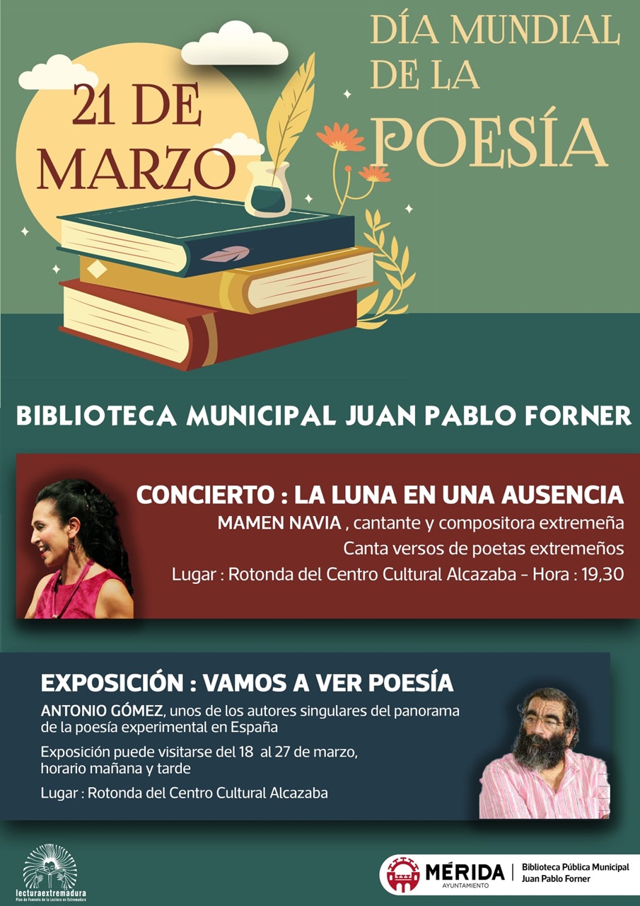Además, con motivo del Día Internacional de la Poesía, la biblioteca municipal organiza el concierto La luna en una ausencia con Mamen Navia, cantante y compositora, que pone voz y música poemas de Rosa Lencero, Carolina Coronado, Dulce Chacón, Lola Santiago, Pureza Canelo, Ada Salas, Irene Sánchez Carrón, María Rosa Vicente Olivas y María José Flores. Este evento será el día 21 de marzo a las 19.30 horas en el Centro Cultural Alcazaba.