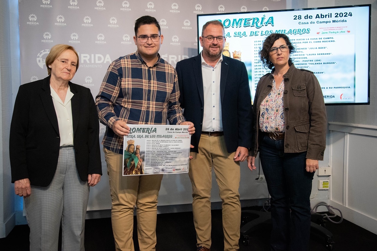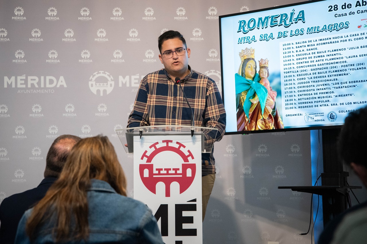 El alcalde, Antonio Rodríguez Osuna, y la delegada de Participación Ciudadana, Susana Fajardo, han presentado junto con la directiva de la Asociación de Vecinos de Nueva Ciudad su Romería en honor a Nuestra Señora de Los Milagros. Un evento social, lúdico y cultural que volverá a reunir en la Casa de Campo de Mérida a miles de vecinas y vecinos.