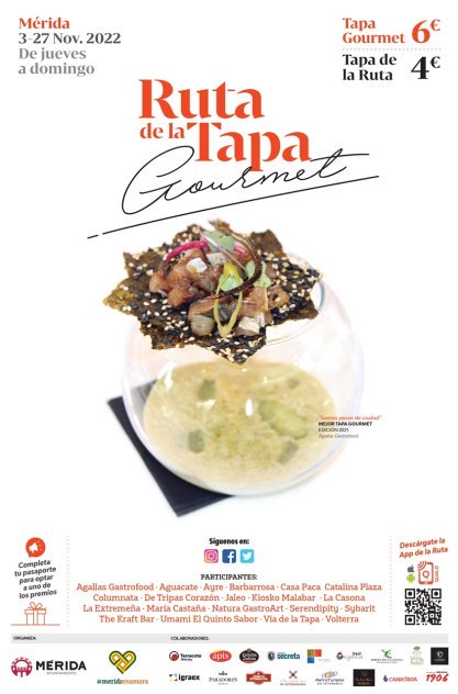 Del 3 al 27 de noviembre de 2022 (de jueves a domingo) se desarrollará una nueva edición de la Ruta de la Tapa Gourmet de Mérida en la que participarán 20 establecimientos de diferentes puntos de la ciudad.