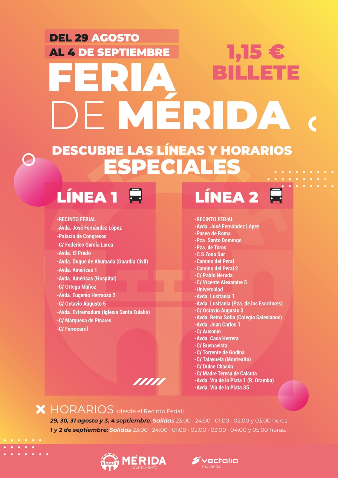 Transportes Urbanos ofrece, durante los días de Feria, servicios especiales en horario nocturno con salidas cada hora desde el recinto ferial a partir de las 23 horas, cuando finalice el servicio ordinario. Se habilitan para ello dos líneas que harán recorridos por toda la ciudad. La frecuencia de estas líneas será cada hora, y se realizarán todos los días de Feria; su precio será de 1,15 €.