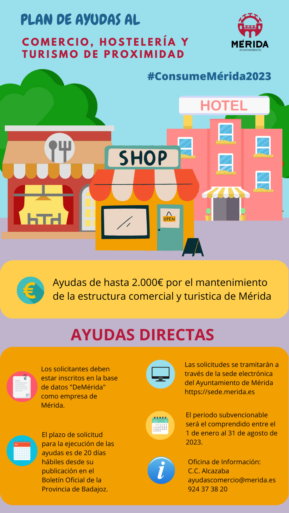 Las ayudas se distribuirán en una única línea para el mantenimiento de la estructura comercial y turística de Mérida incluyendo el mantenimiento de los puestos de trabajo e incentivando a la contratación de trabajadores/as a través de ayudas directas.