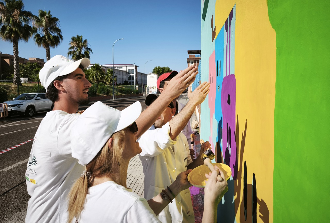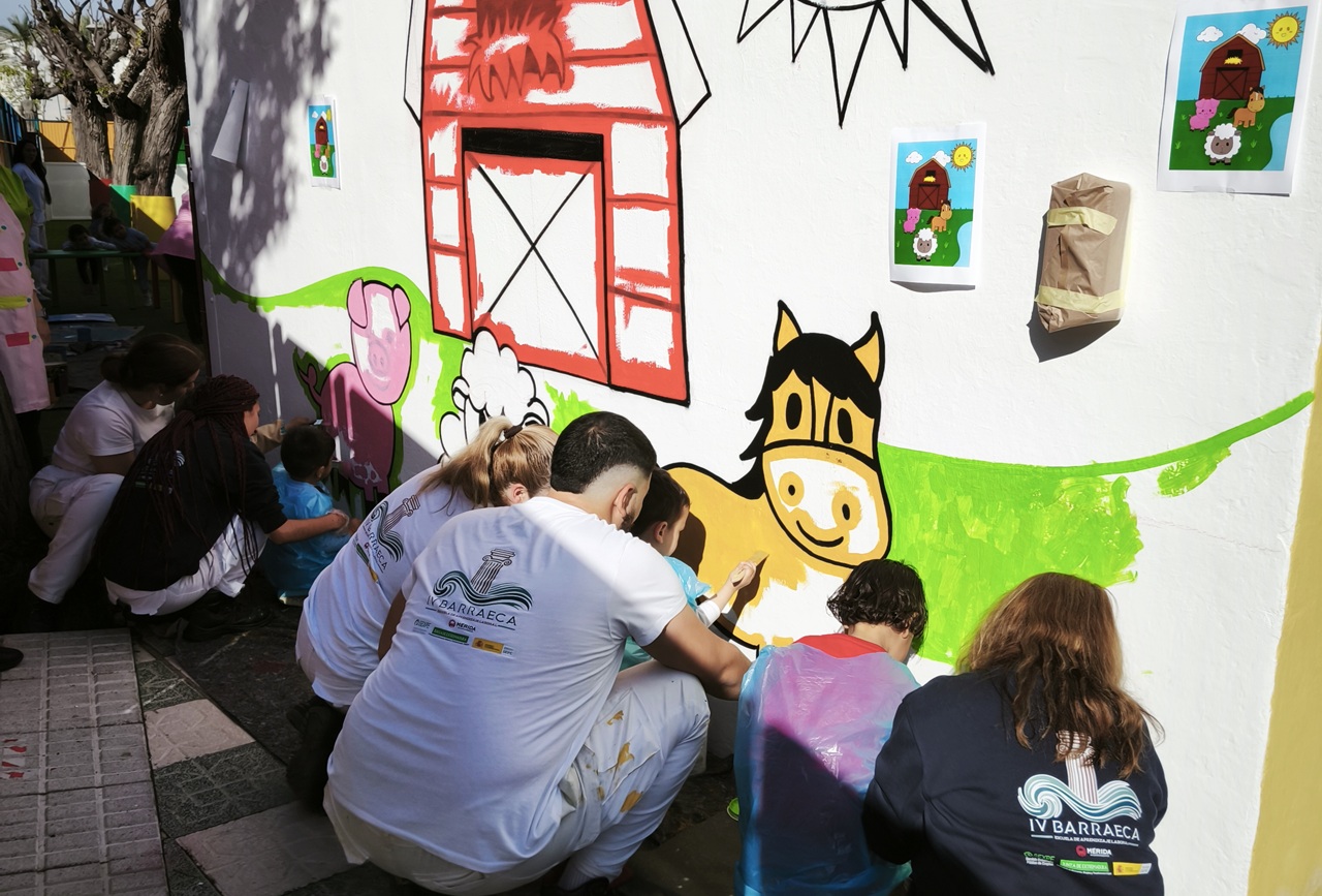 Realización de un mural de gran formato en pared titulado “En Mérida todas las personas encajamos” a cargo de los participantes en la especialidad Pintura decorativa en construcción con la colaboración del alumnado de la Escuela de Arte y Superior de Diseño y personas con discapacidad del Centro Ocupacional Proserpina.