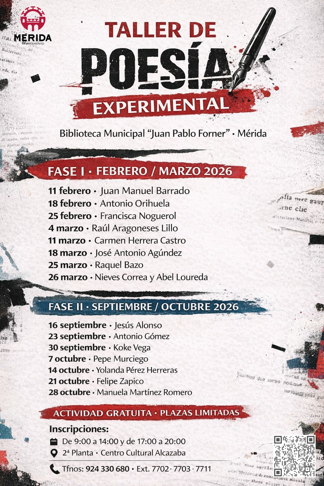 A partir del miércoles 11 de febrero la Biblioteca Municipal pone en marcha un taller de Poesía Experimental, diseñado para las personas que deseen conocer o profundizar aún más en un concepto de poesía que transciende a los recursos estilísticos tradicionales. La poesía experimental abarca, en conjunto, distintas y múltiples manifestaciones denominadas poesía concreta, poesía visual, poesía objeto, poesía sonora y poesía acción, que son los términos más empleados.