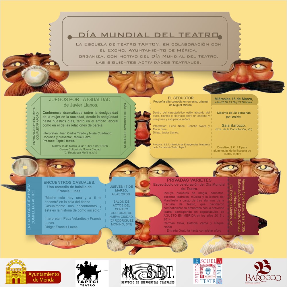 Se cierran las actividades el viernes 18 en el mismo lugar de Nueva Ciudad, con un espectáculo de celebración del Día Mundial del Teatro, desde las 20.30 horas, y que será una jornada de encuentro y convivencia, con un pequeño espectáculo de variedades antes de la lectura del Manifiesto, “que correrá a cargo de tres alumnas de la Escuela de Teatro, que decidieron compatibilizar su embarazo con la actividad teatral de Agusto en Mérida en los años 2013 y 2014”, señaló Llanos. Se trata de Carmen Silva, Patricia Zama y Raquel Nodar