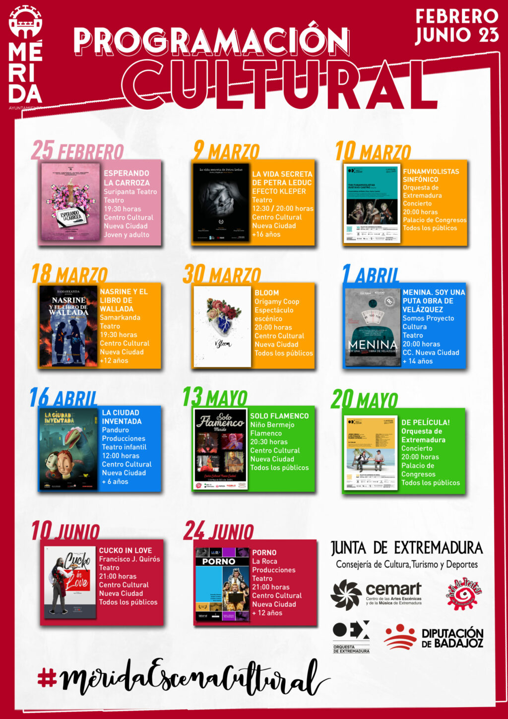 La delegada de Cultura, Silvia Fernández, ha presentado un avance de la programación cultural prevista en la ciudad hasta el próximo mes de junio en el Centro Cultural de Nueva Ciudad que contempla teatro, música, espectáculos infantiles, clown, danza, flamenco y humor para que puedan disfrutar de la cultura en Mérida tanto jóvenes, adultos como niños y niñas.