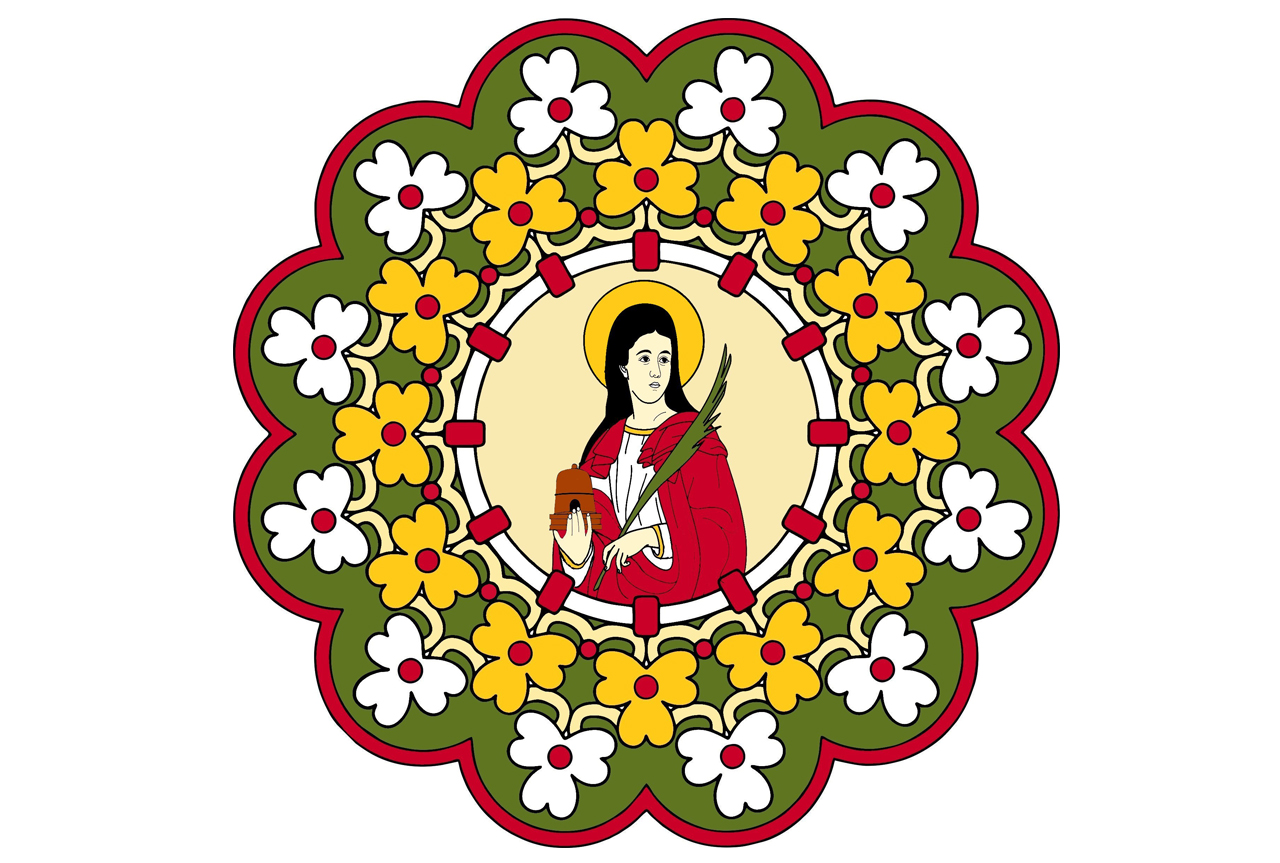 La alfombra de nueve metros de diámetro y unos 70 metros cuadrados, reproduce como motivo central, la imagen de Santa Eulalia, que porta en una mano el Hornito y en la otra la Palma del Martirio. La imagen de la Santa, está rodeada por una doble corona, por ser Virgen y Mártir, la interior de color oro y rojo. El color dorado en la Biblia representa lo celestial y La perseverancia en las pruebas que se nos presentan y el rojo es el símbolo de la sangre, del Amor, la Caridad, el sacrificio y el martirio. La Corona, exterior, de color blanco, representa la pureza y la inocencia. La cenefa de arcos rojos que cierra la alfombra es una alegoría del Acueducto de los Milagros de Emérita Augusta, donde vivió y murió Santa Eulalia. La imagen de Santa Eulalia está rodeada de un color pardo que es una alusión al color de la tierra de Mérida. El fondo verde, representa a Galicia de donde proviene los alfombristas que realizarán la ofrenda floral. La alfombra fue diseñada por Andrea Estévez y Miguel García