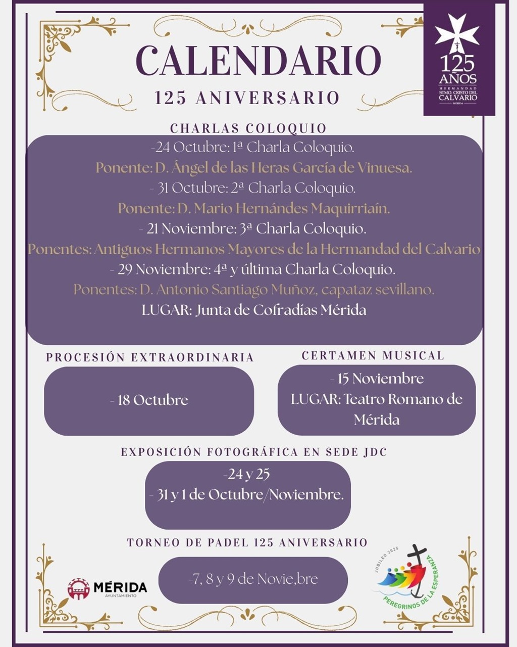 En medio de toda esta programación, un certamen de bandas en el Teatro Romano con la presencia de la Banda de Cornetas y Tambores de la OJE de Mérida, Agrupación Musical Nuestra Señora de La Paz, Banda de Cornetas y Tambores “Virgen del Pilar” de Villafranca de los Barros, Agrupación Musical La Oliva de Mérida, cerrando el cartel la Banda de Cornetas y Tambores del Santísimo Cristo de las Tres Caídas de Triana. La programación incluye una exposición, en la sede de la Junta de Cofradías, sobre la historia de la hermandad a través de sus imágenes, para la que han contado con el equipo gráfico de la web de la Junta de Cofradías, www.semanasantademerida.es, los días 24 y 25 de octubre y 31 de octubre y 1 de noviembre y y torneo de pádel el 7, 8 y 9 de noviembre.